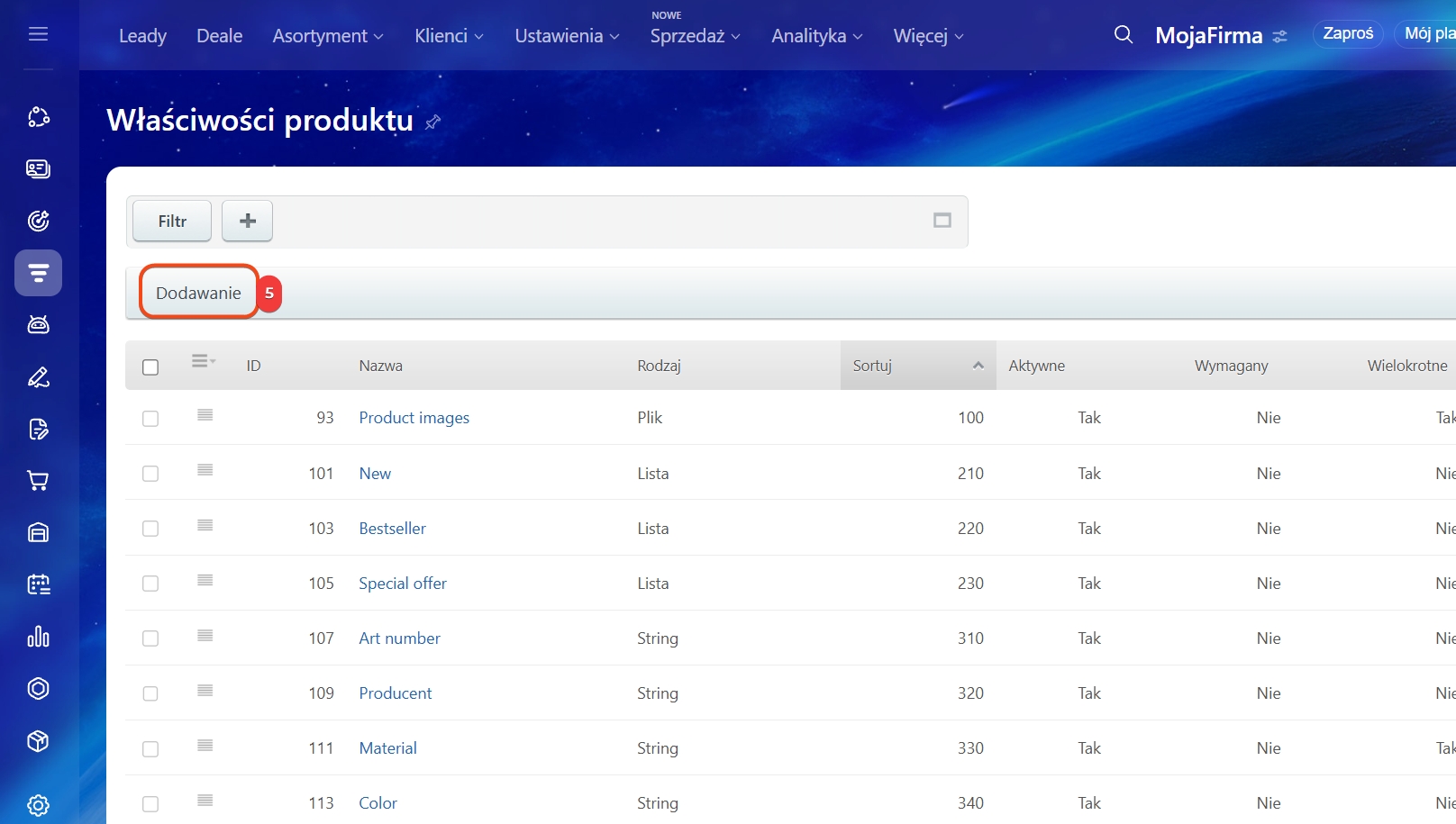 - Aby skonfigurować właściwość, przejdź do: CRM → Ustawienia → Ustawienia CRM → Ustawienia produktów → Dodawanie.