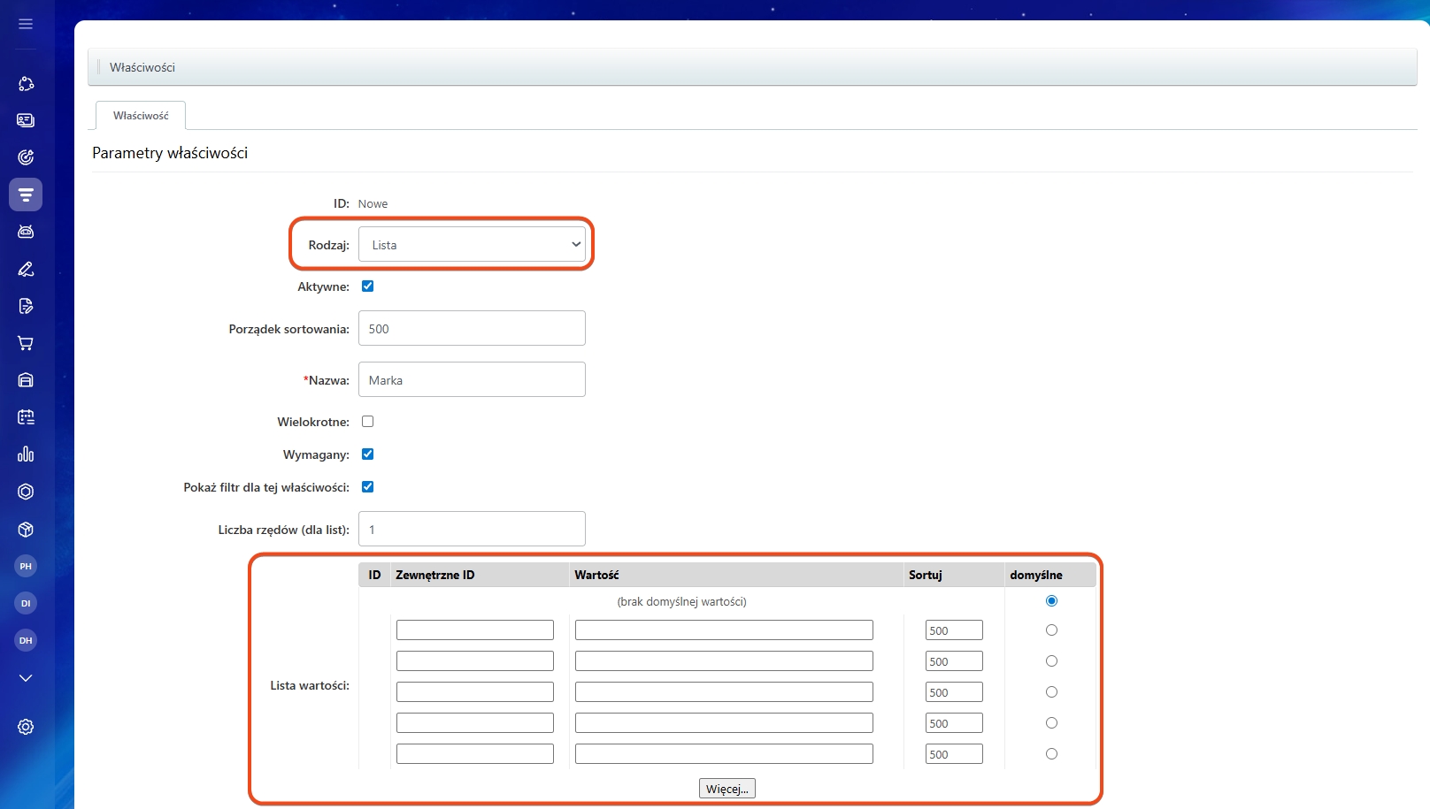 - Kolejność sortowania — określa pozycję właściwości na liście. Mniejsza wartość = wyższa pozycja (np. 100 → wyżej niż 200).