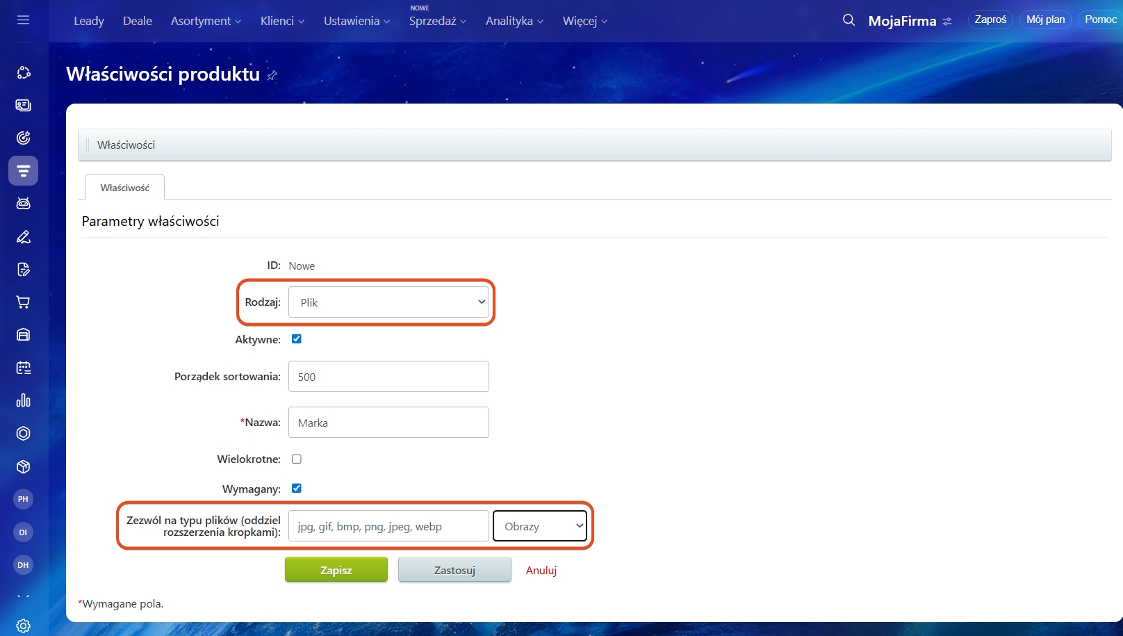 W kartach produktów i usług dostępne są standardowe pola opisujące podstawowe cechy (np. nazwa, jednostka miary). Aby dodać niestandardowe parametry, możesz utworzyć nowe pola – zarówno w ustawieniach CRM, jak i bezpośrednio w karcie wybranego produktu.