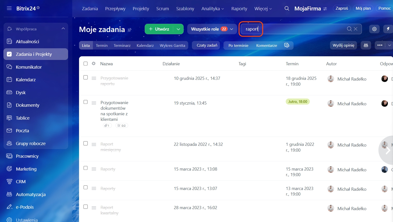 Inteligentne wyszukiwanie pozwala szybko wyszukać potrzebne zadanie. Wpisz w polu wyszukiwania słowo lub jego fragment – Bitrix24 pokaże pasujące zadania. Na przykład na liście znajduje się zadanie „Przygotować raport ze sprzedaży za marzec”. Wystarczy wpisać „raport”, „sprzedaż” albo fragment „sprzed” – w wynikach pojawią się zadania, w których ten tekst występuje w tytule lub opisie.