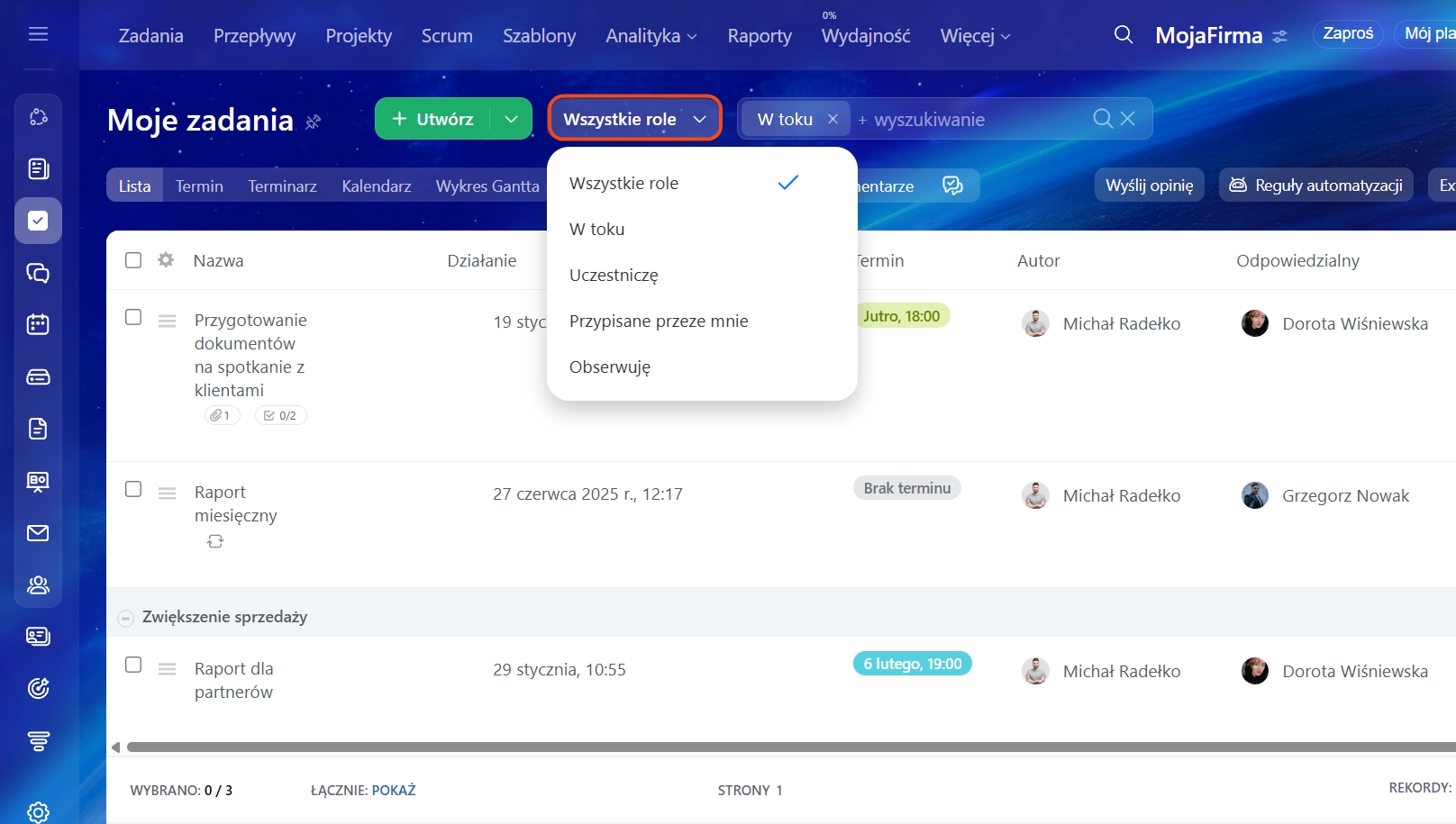 Filtr według ról – pokazuje zadania w zależności od Twojej roli. Wybierz odpowiednią: