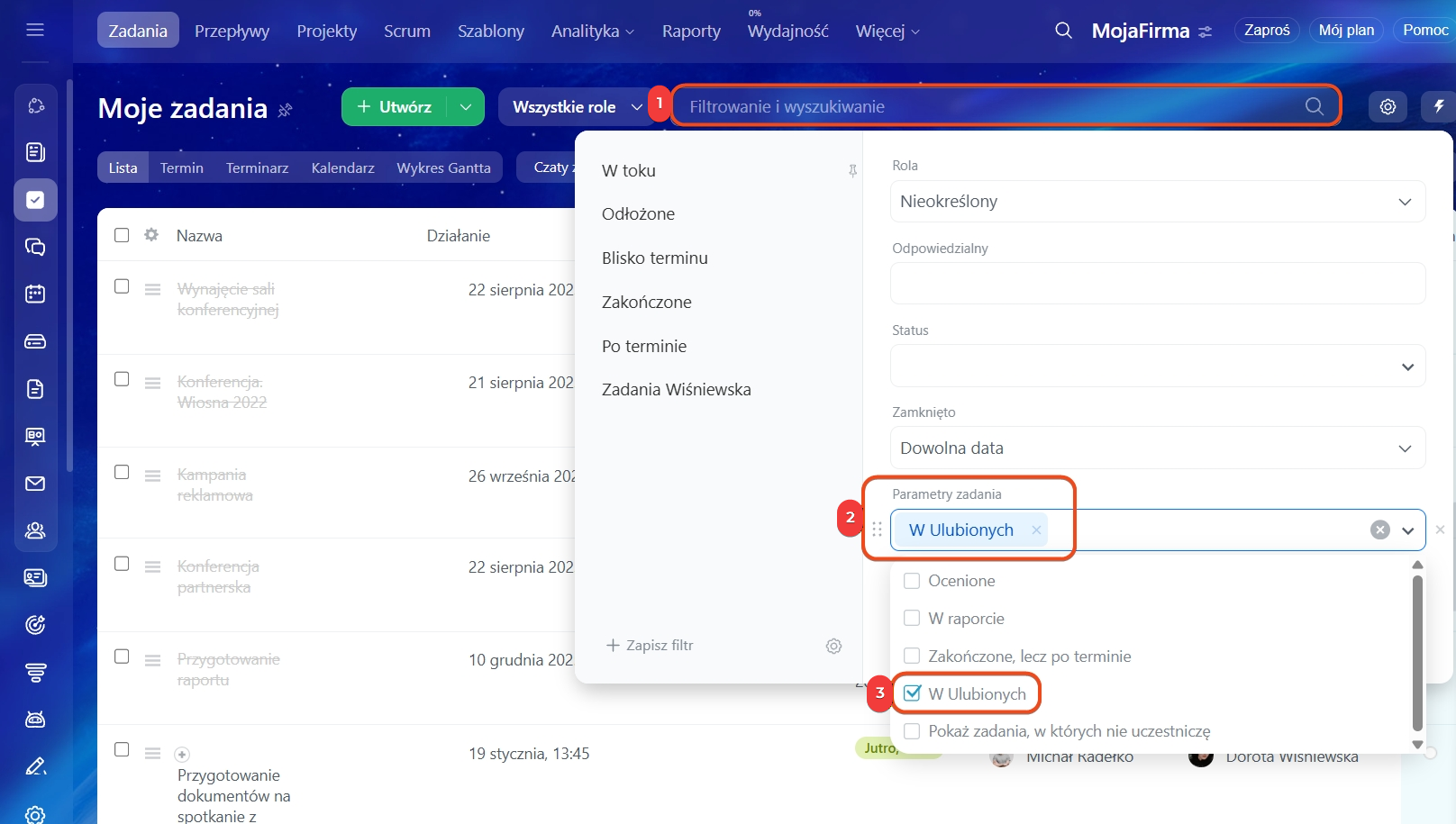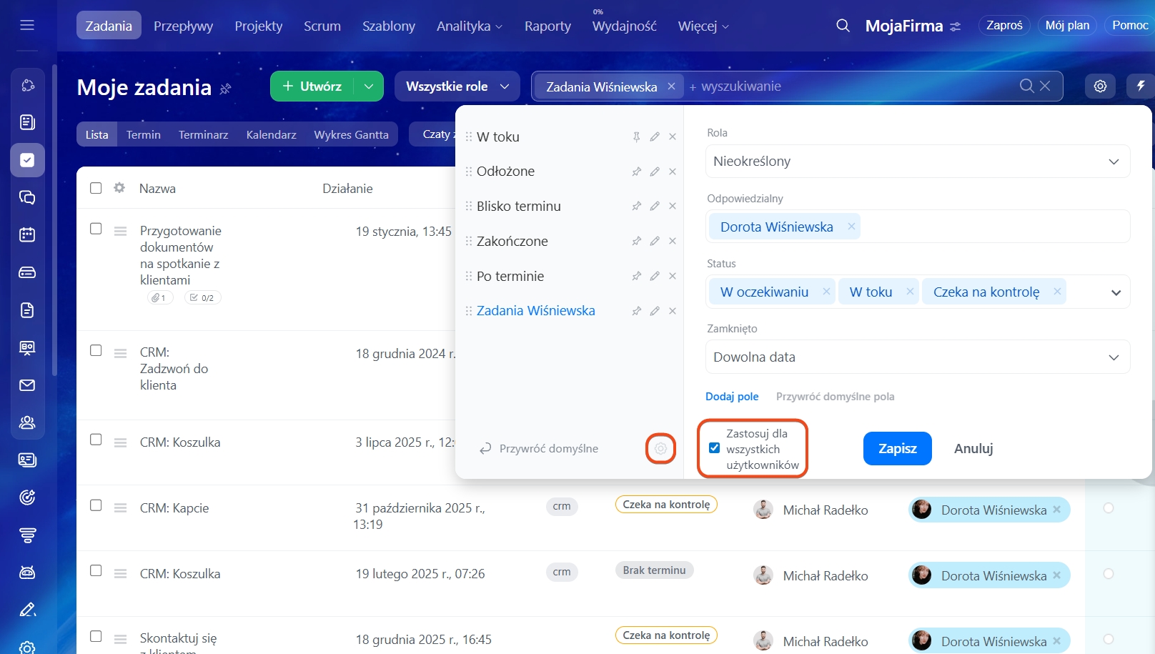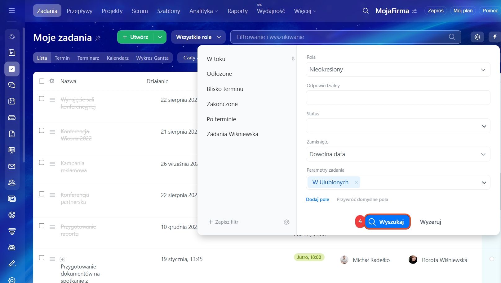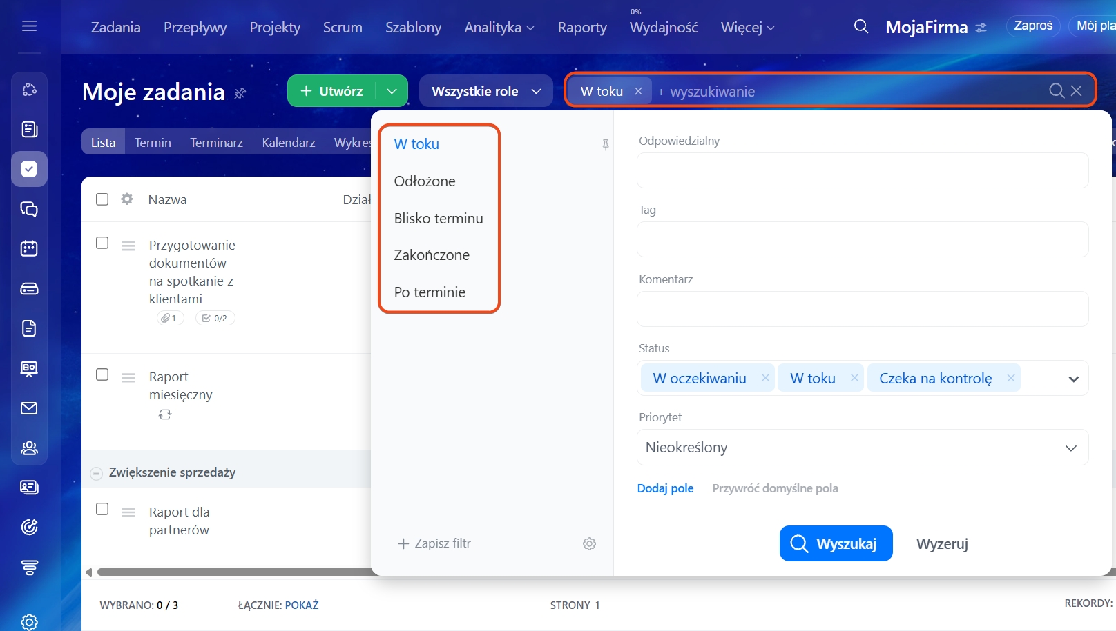 W zadaniach znajdziesz gotowe filtry według ról i statusów. Pozwalają one błyskawicznie znaleźć potrzebne zadania bez ręcznego tworzenia filtrów – na przykład możesz osobno wyświetlić zadania, które wykonujesz lub które zleciłeś.