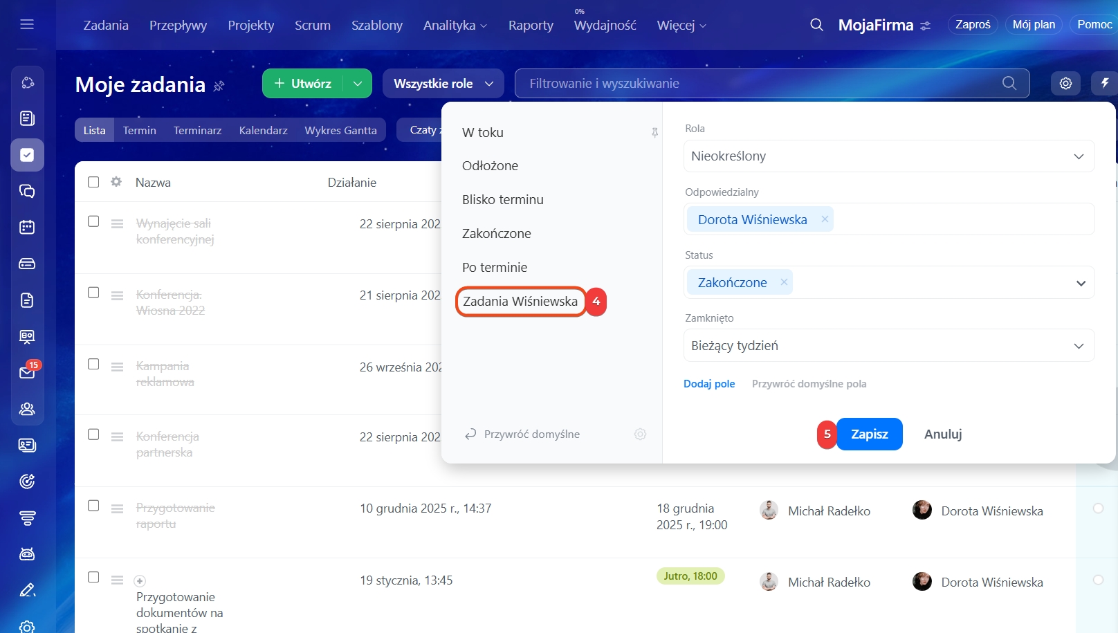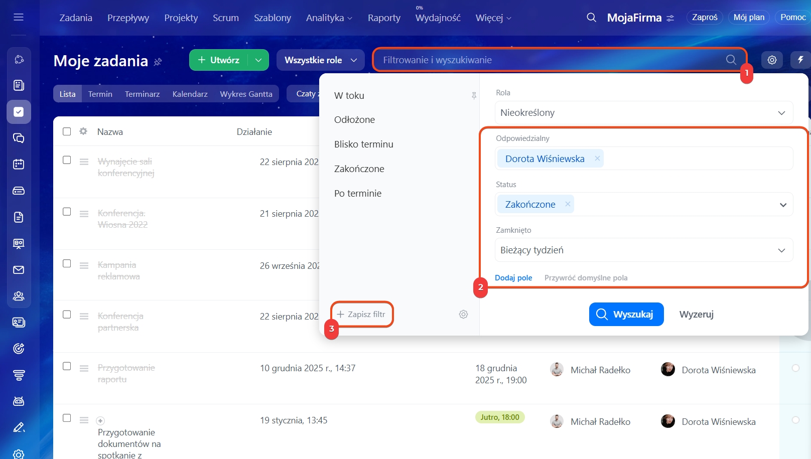 Często używane filtry warto zapisać, aby nie ustawiać ich za każdym razem od nowa. Na przykład możesz stworzyć filtr pokazujący zadania konkretnego pracownika zakończone w bieżącym tygodniu.