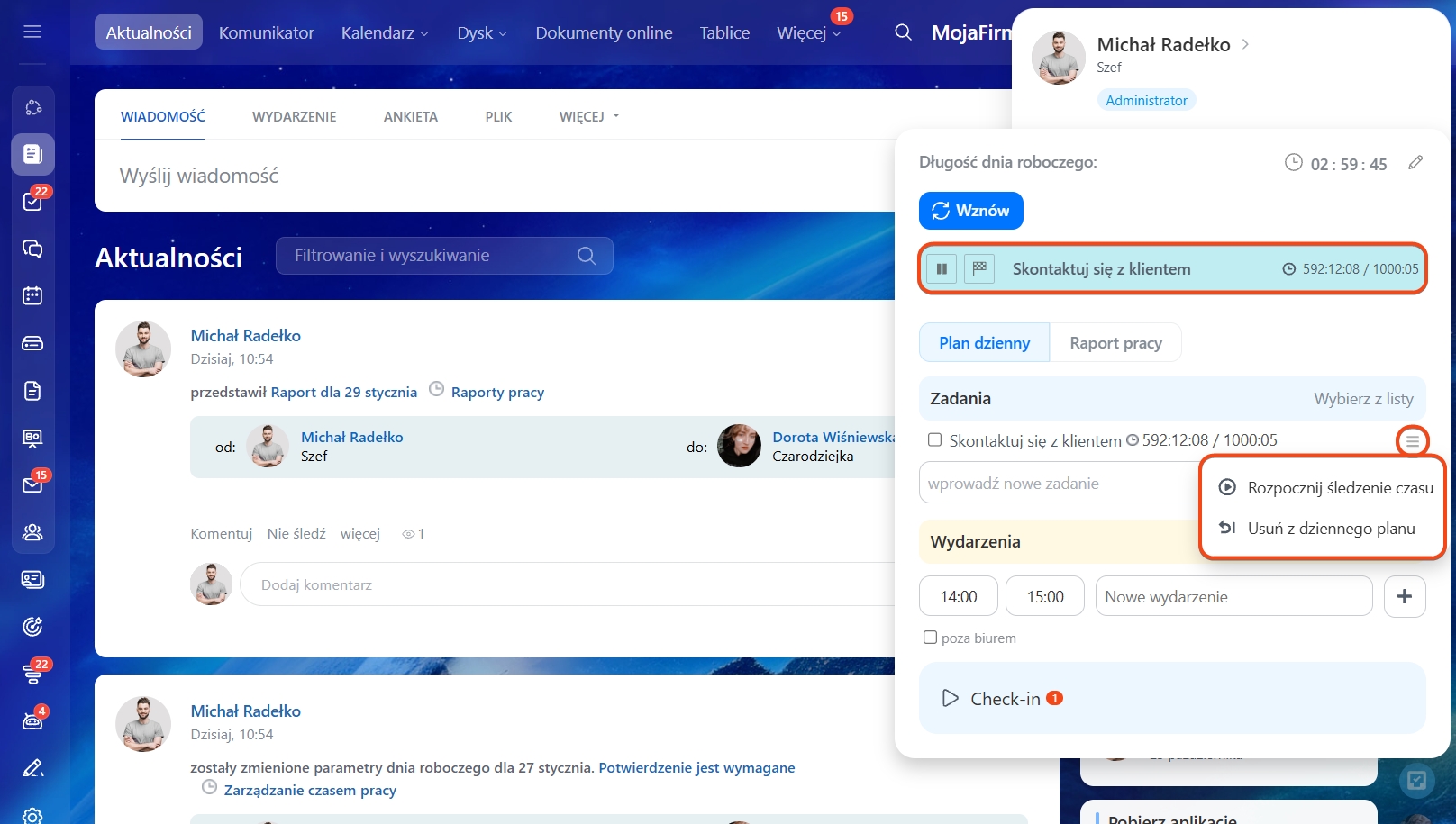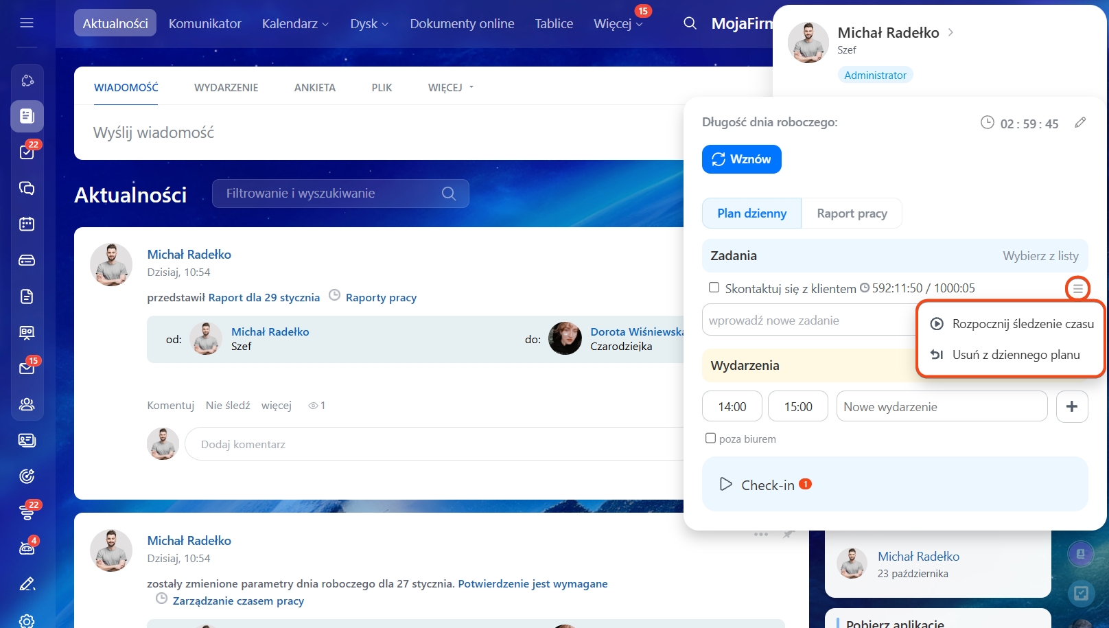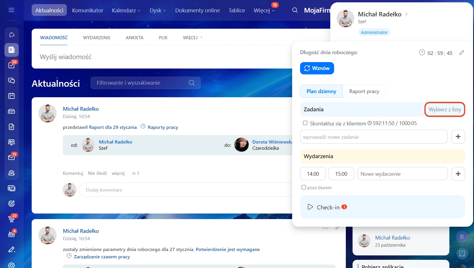 - Kliknij swoje zdjęcie profilowe → wybierz Plan dnia i raport → dodawaj zadania z listy lub twórz nowe.