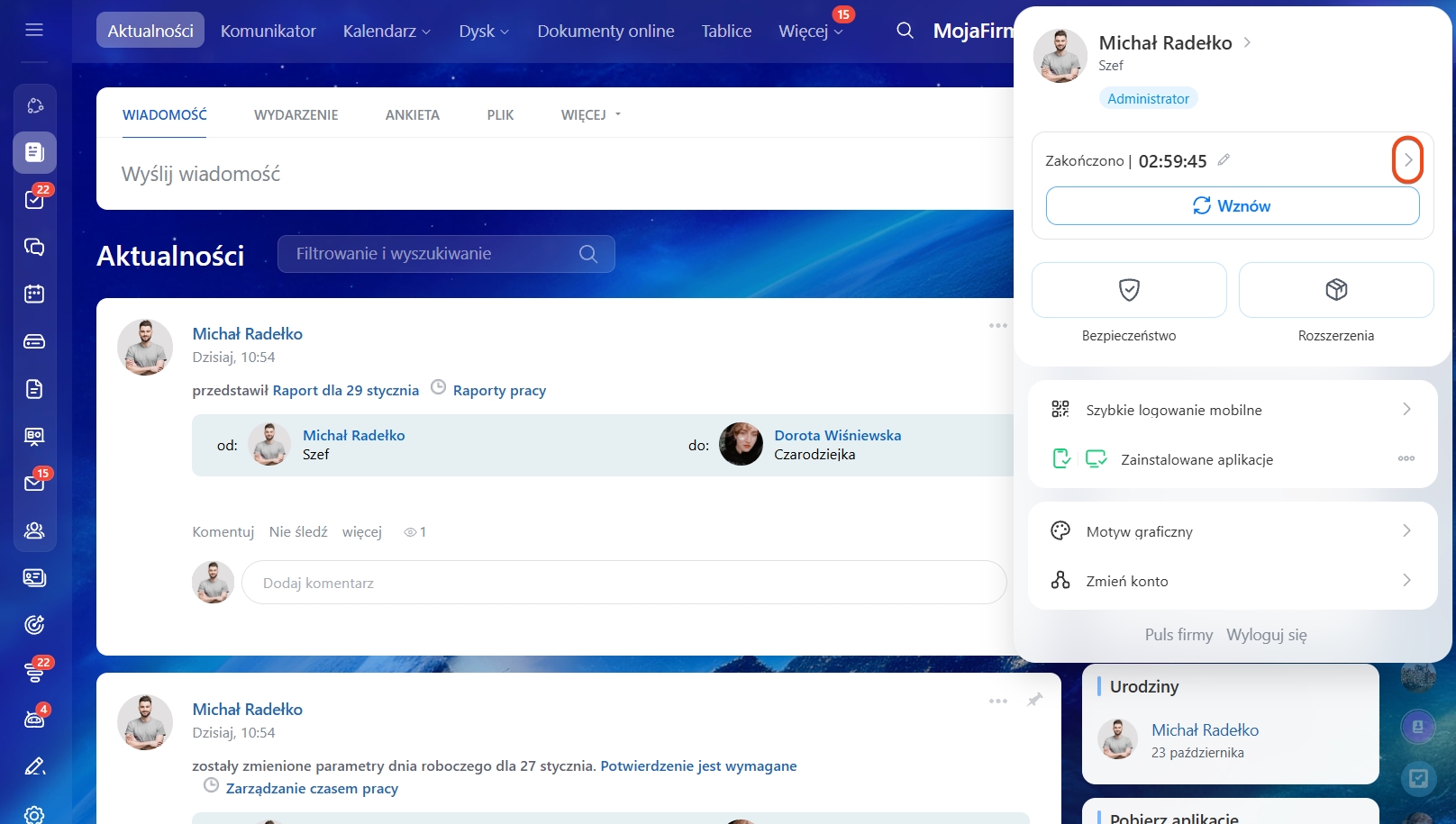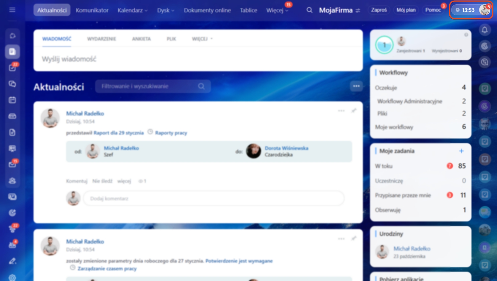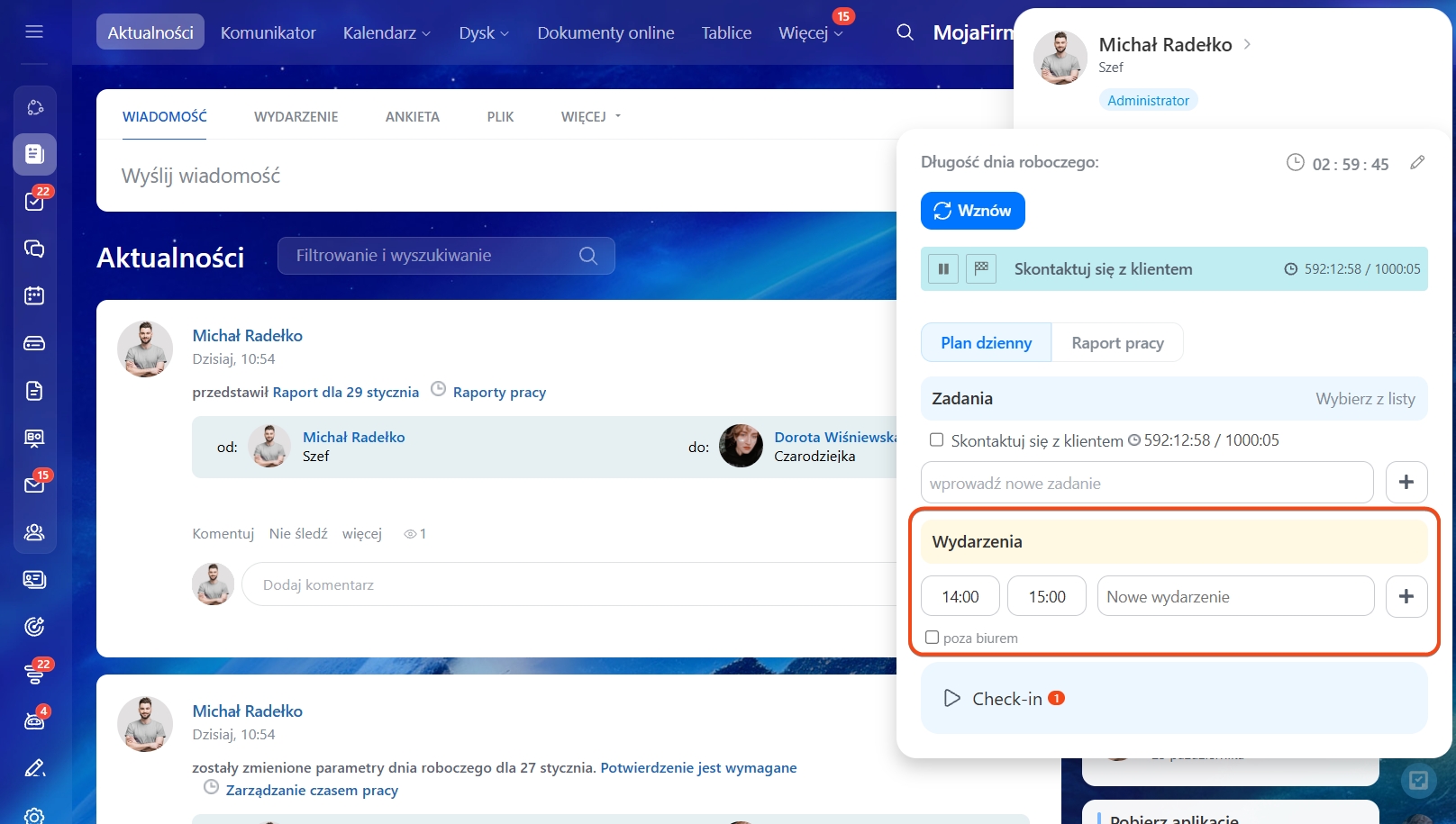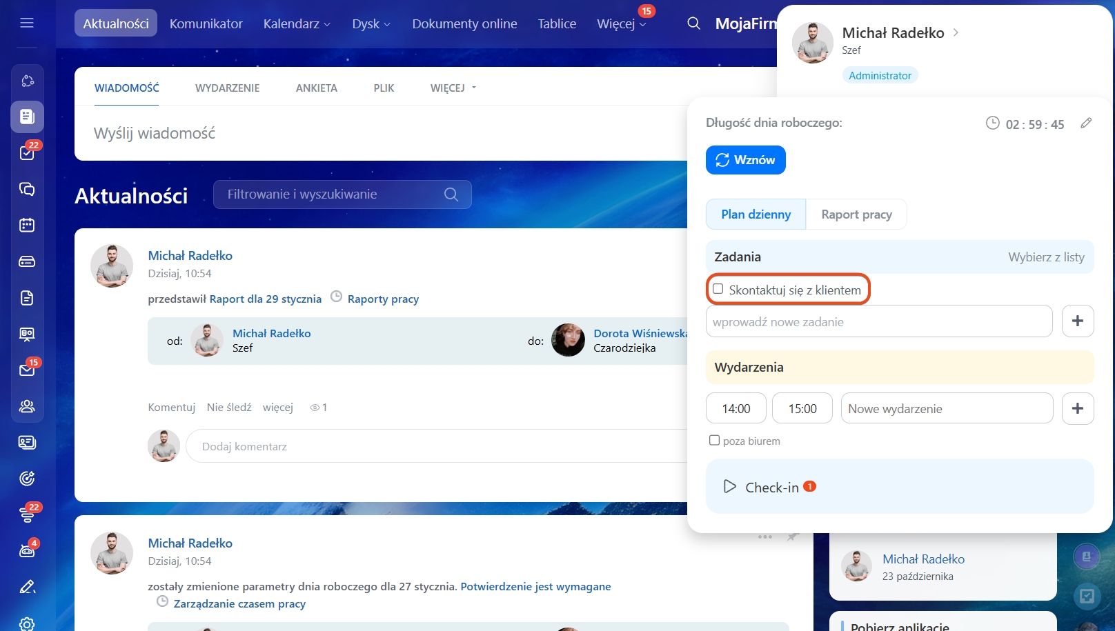 - Kliknij swoje zdjęcie profilowe → wybierz Plan dnia i raport → dodawaj zadania z listy lub twórz nowe.
