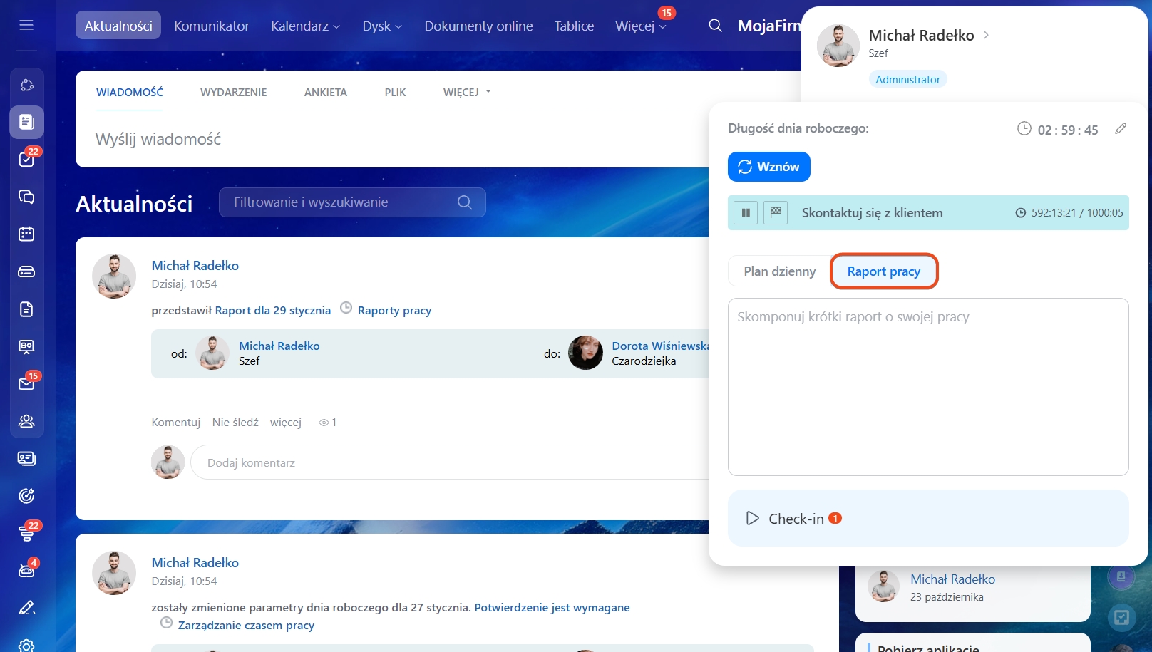 Wypełniaj raport z pracy, aby nie zapomnieć o wykonanych zadaniach. Wszystkie dane z raportów dziennych automatycznie sumują się w raporcie tygodniowym.