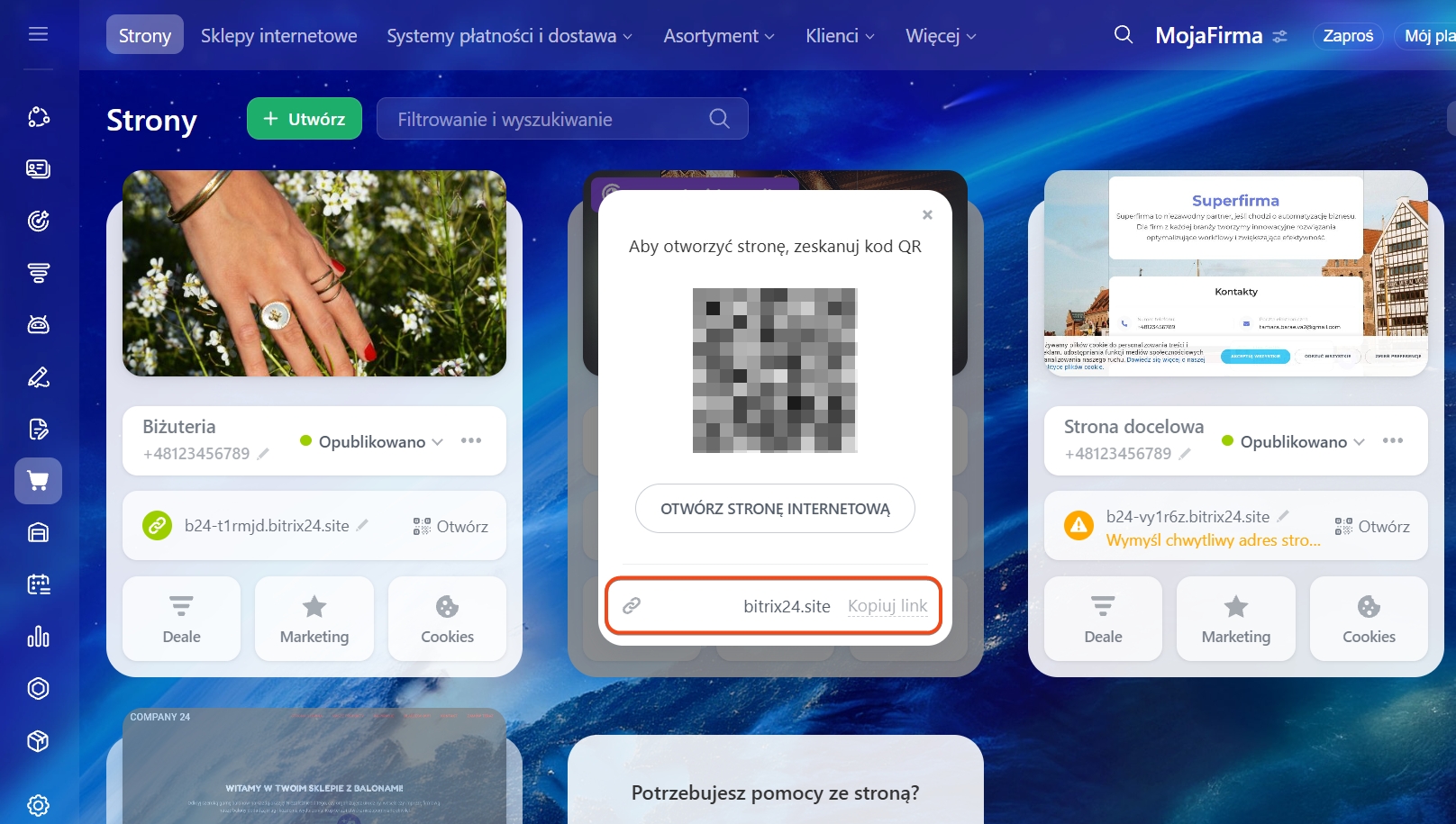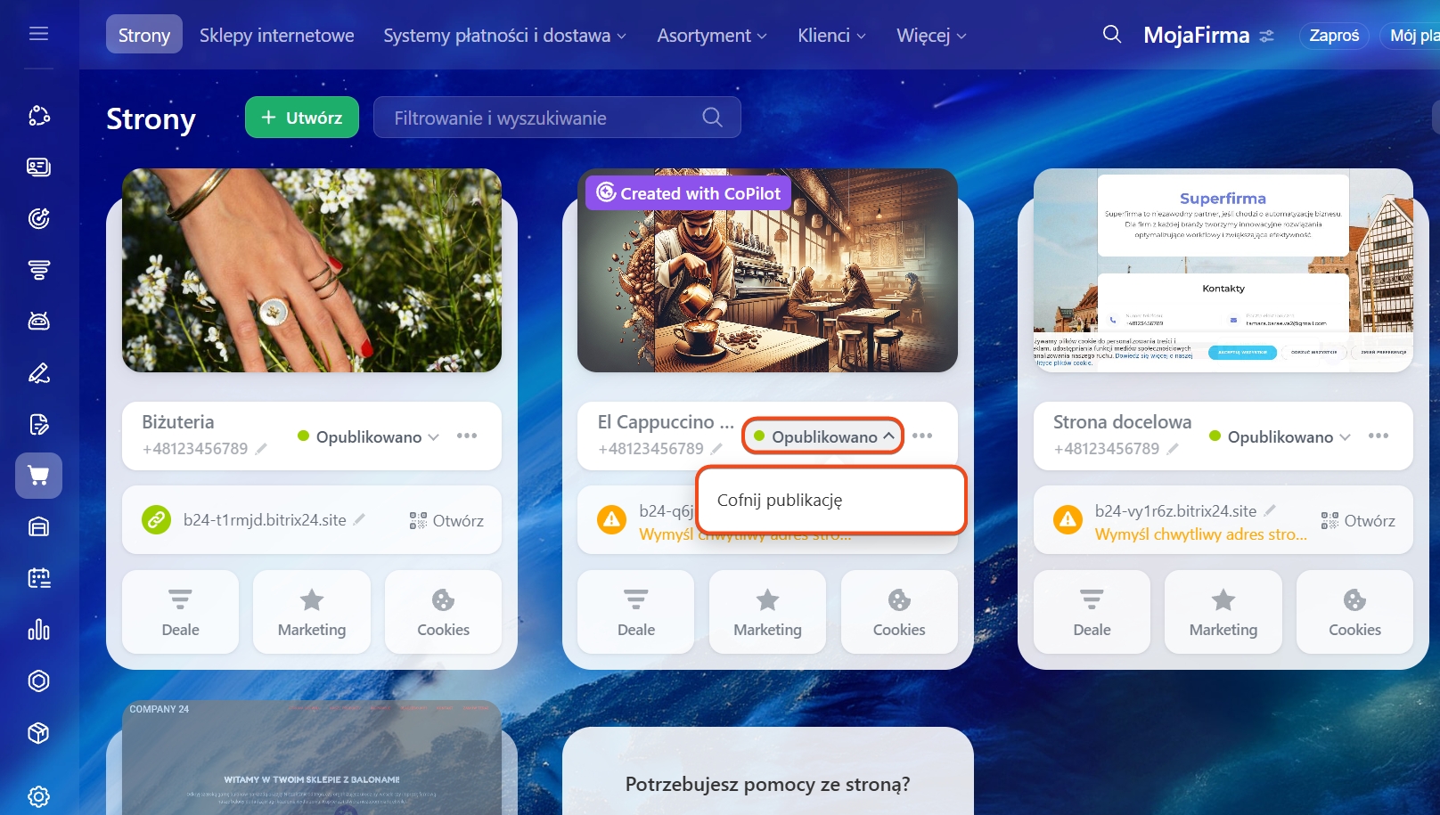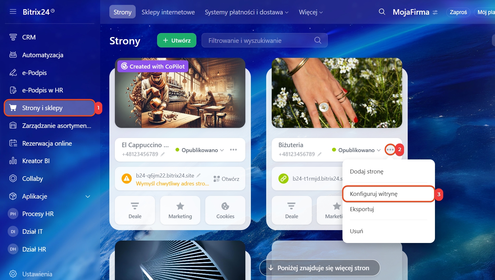1. Przejdź do sekcji Strony i sklepy i wybierz zakładkę Strony lub Sklepy.