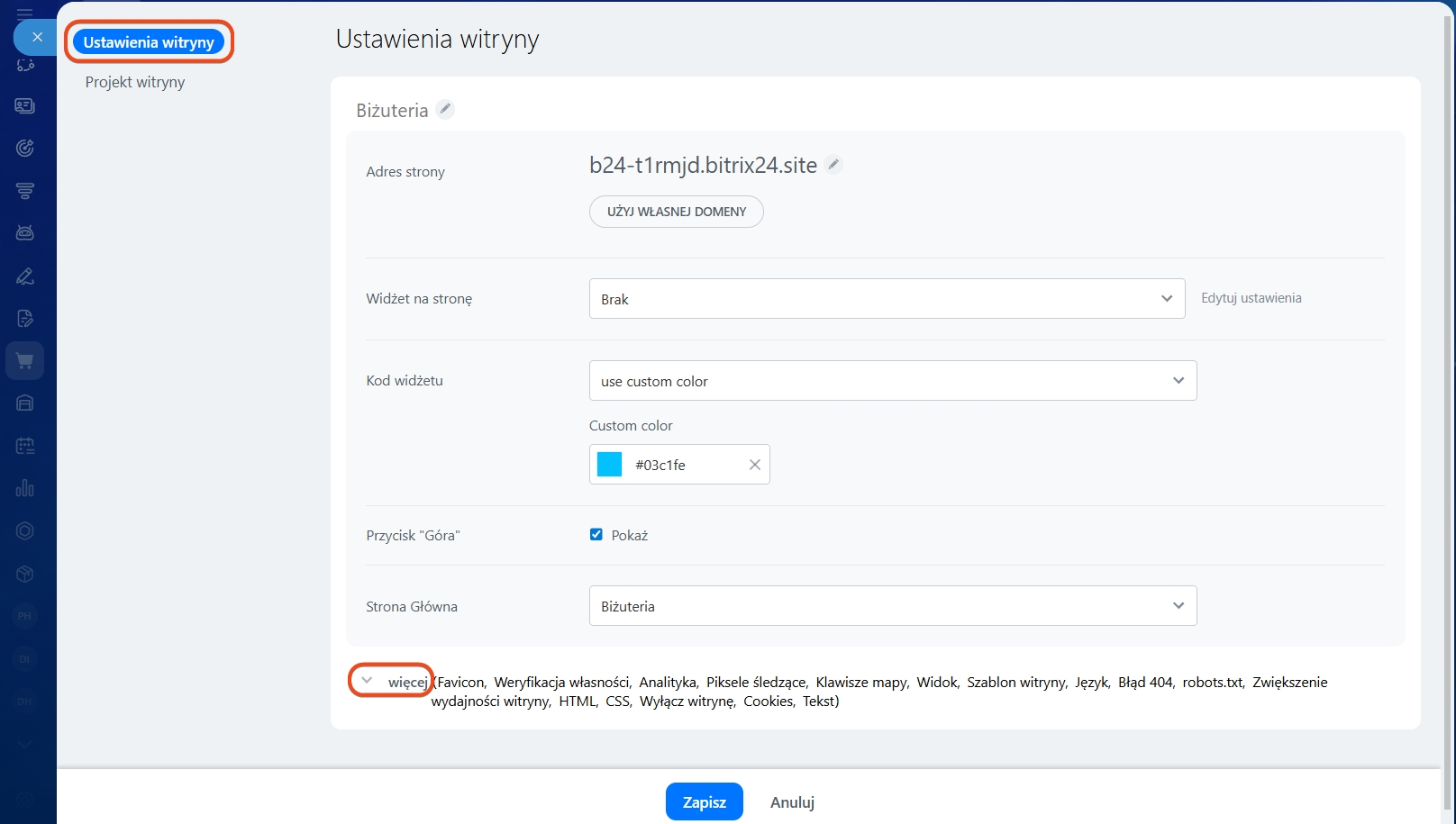 - Aby przyspieszyć witrynę, przejdź do Strony i sklepy → Strony, wybierz witrynę, kliknij Trzy kropki (…) → Ustawienia witryny → Więcej. W sekcji Zwiększenie wydajności witryny włącz opcje Optymalizuj czas ładowania strony i Używaj leniwego ładowania obrazów. Zapisz zmiany.