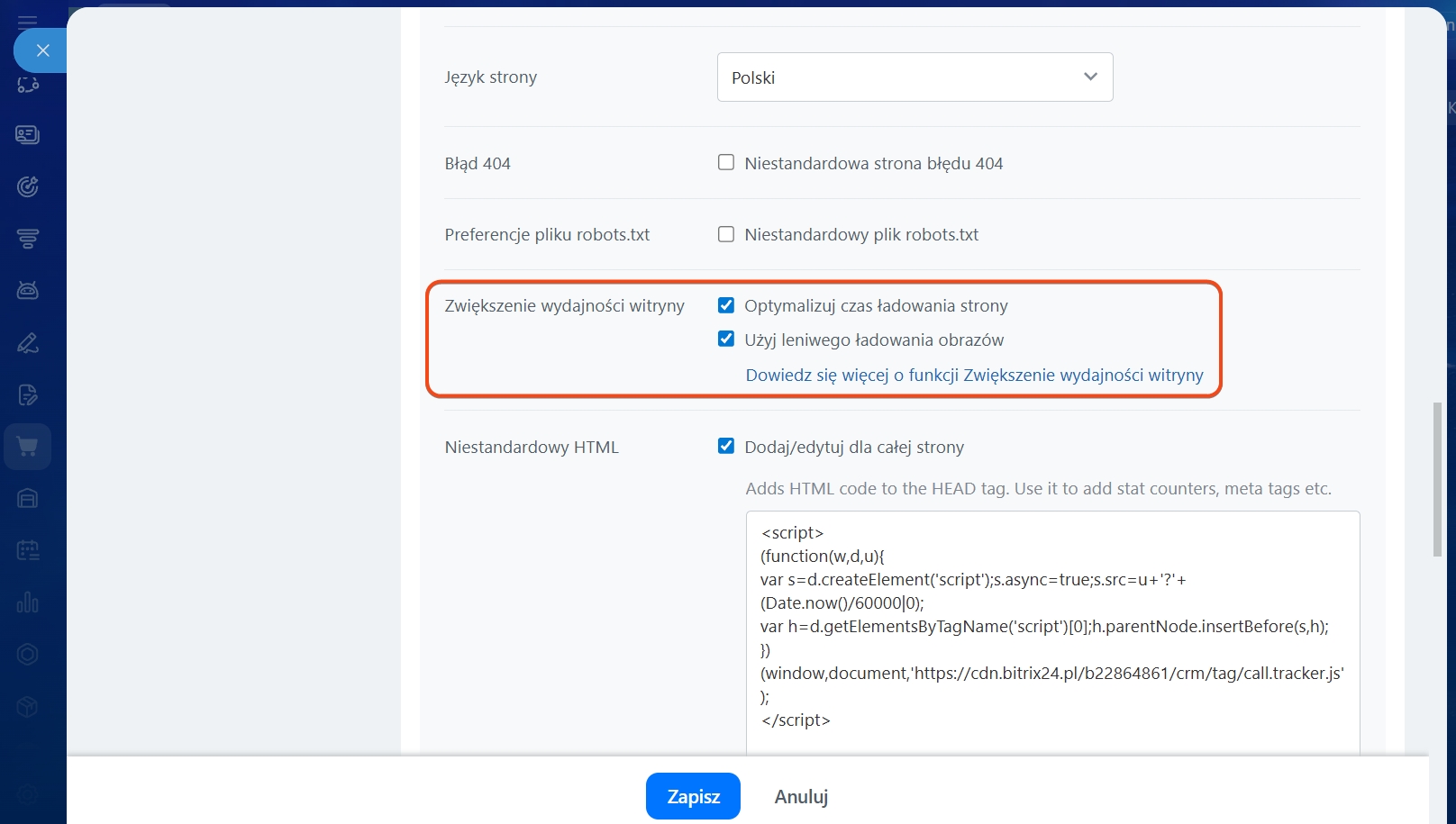 4. W sekcji Zwiększenie wydajności witryny włącz opcje Optymalizuj czas ładowania strony oraz Używaj leniwego ładowania obrazów.