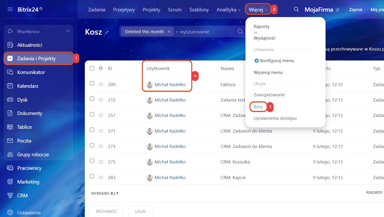 1–4. Przejdź do sekcji Zadania i projekty → Więcej → Kosz. Wyświetli się lista zadań wraz z informacją, kto i kiedy je usunął.