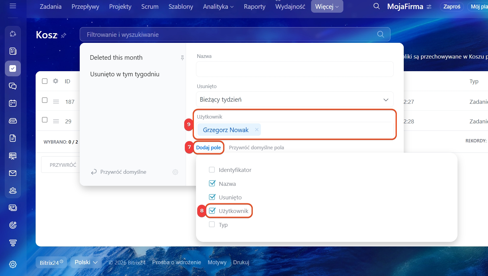 7–9. Jeśli jesteś administratorem Bitrix24, usunięte zadania konkretnego pracownika znajdziesz przez filtr: dodaj pole Użytkownik i wybierz odpowiednią osobę.