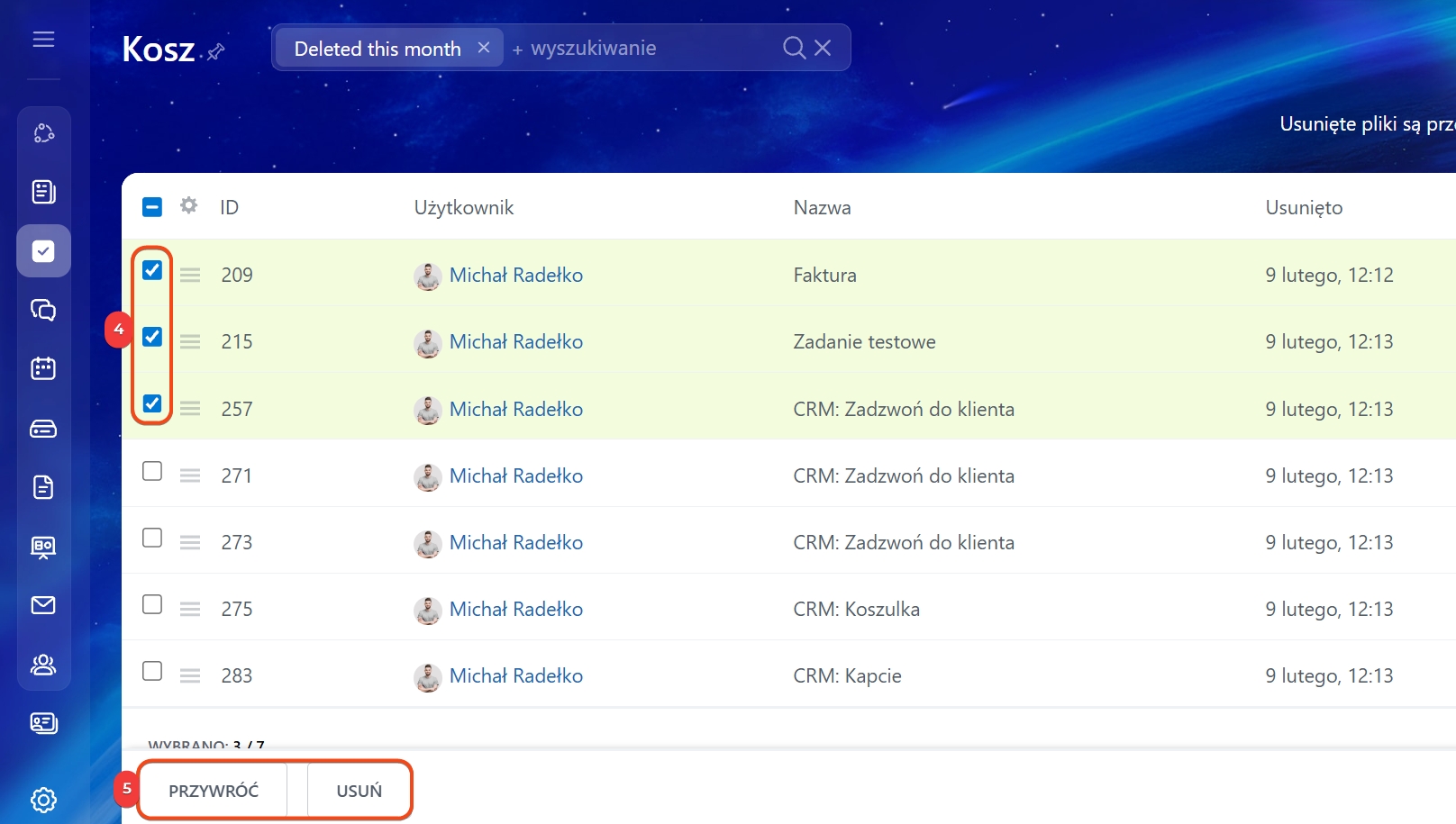 4–5. Zaznacz jedno lub kilka zadań i wybierz żądane działanie: usuń lub przywróć.