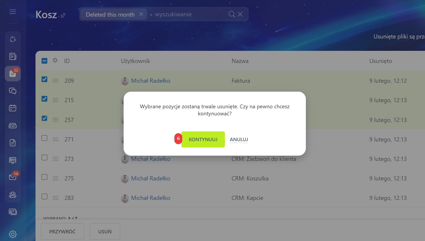 Każdy użytkownik może przywracać i usuwać z kosza wyłącznie zadania, które sam usunął. Administrator Bitrix24 może przywracać i usuwać zadania wszystkich pracowników.