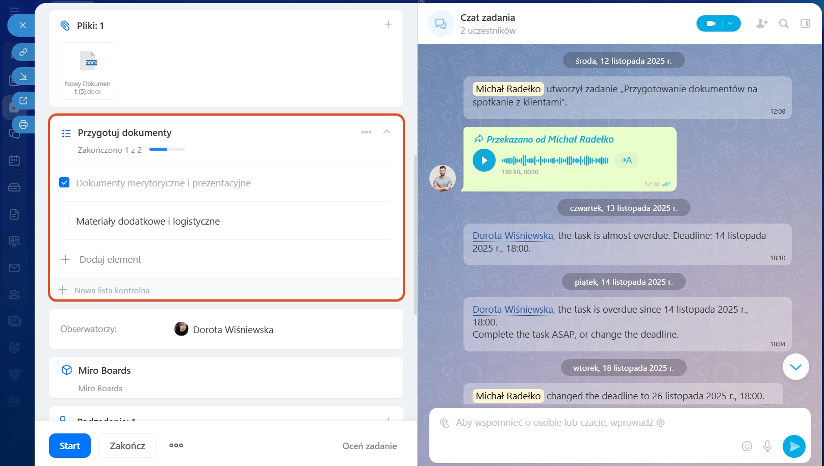 Lista kontrolna. Twórz listę kroków, aby widzieć, co zostało już zrobione. Do listy kontrolnej możesz dodawać podpunkty, przypisywać do nich odpowiedzialnych i dołączać pliki.