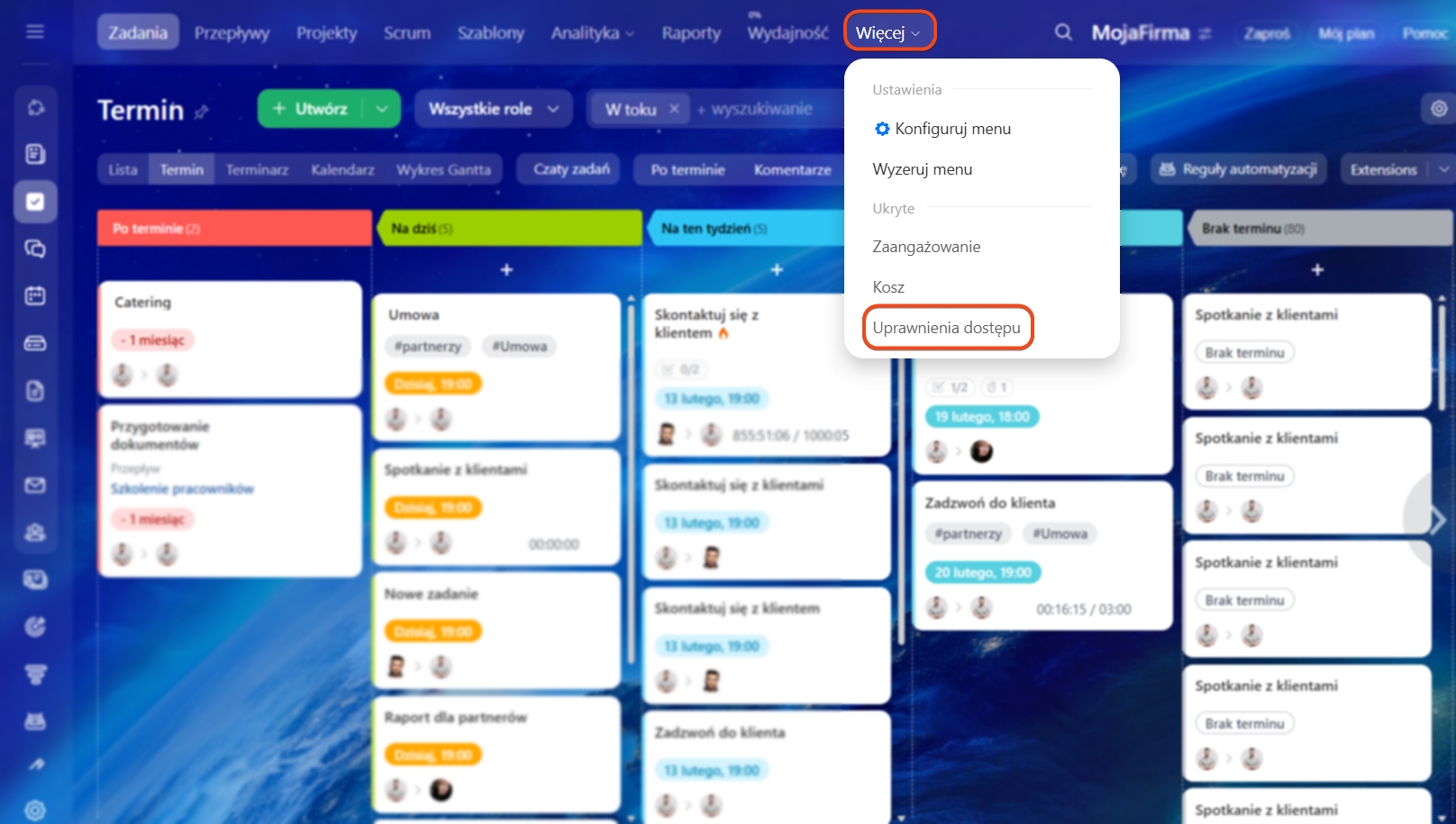 Uprawnienia dostępu określają, co pracownicy mogą robić z zadaniami, szablonami i regułami automatyzacji. Możesz tworzyć role z wybranym zestawem praw (np. zezwolić na edycję, ale zabronić usuwania) i przypisywać je konkretnym osobom lub grupom roboczym.