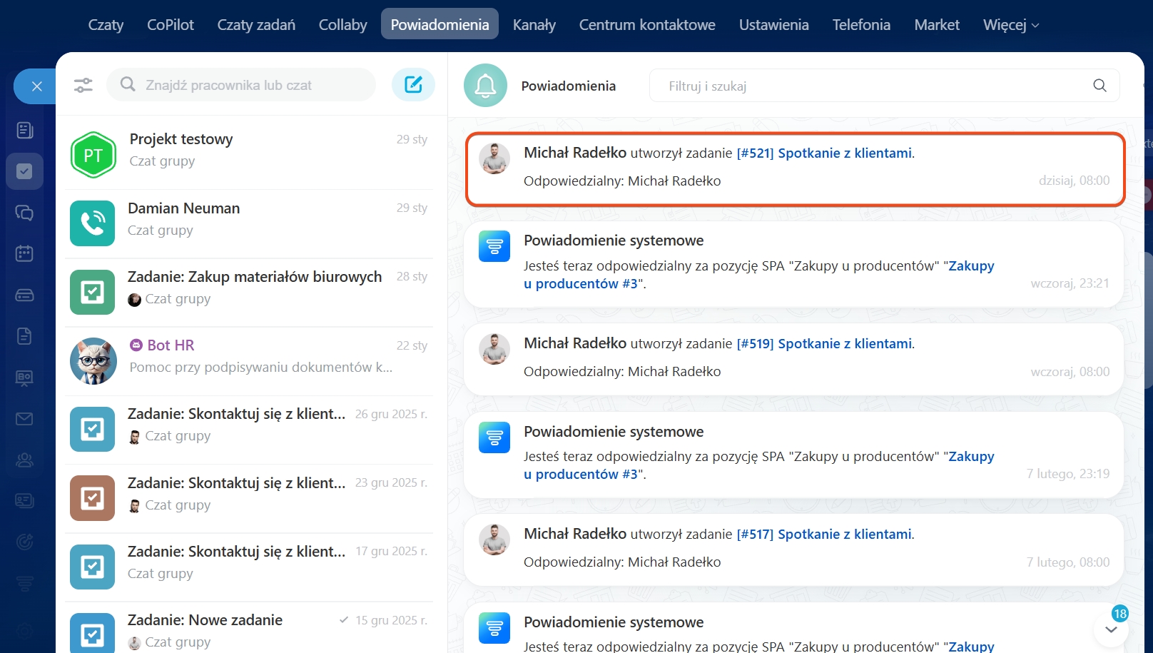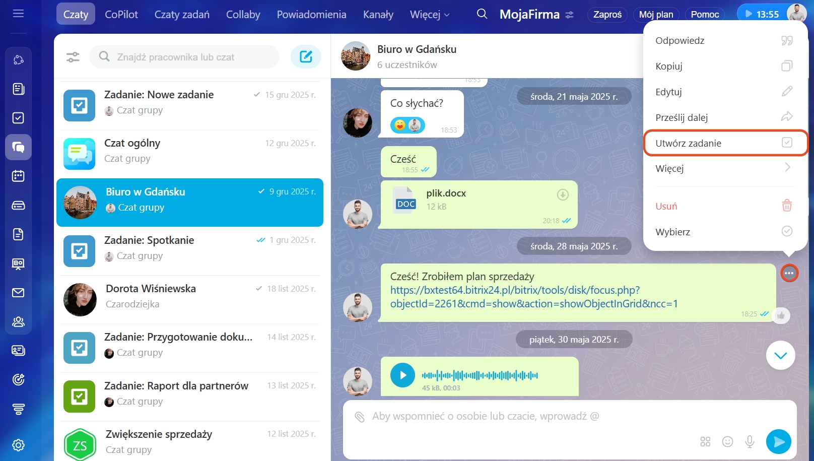 Zadania w Bitrix24 są ściśle powiązane z innymi narzędziami. Jeśli w czacie padło polecenie, możesz od razu utworzyć z tej wiadomości zadanie. Tekst wiadomości stanie się opisem zadania, Ty będziesz Odpowiedzialnym, a uczestnicy czatu – Obserwatorami.