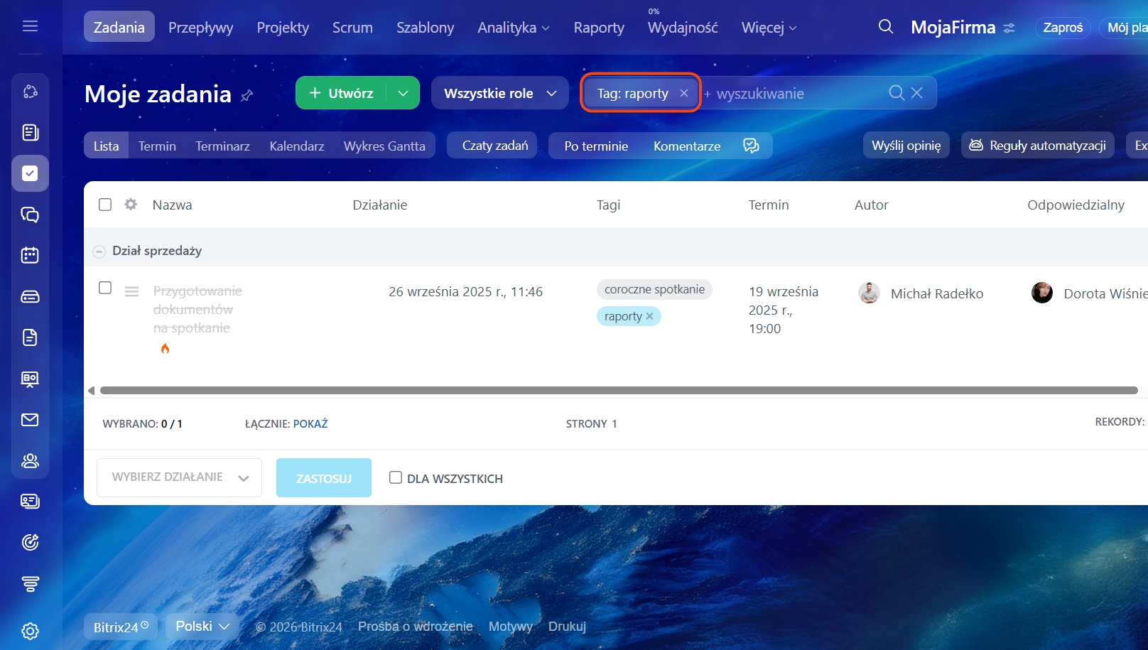 W Bitrix24 znajdziesz szybkie i wygodne filtry, które pomagają odnaleźć konkretne zadanie.