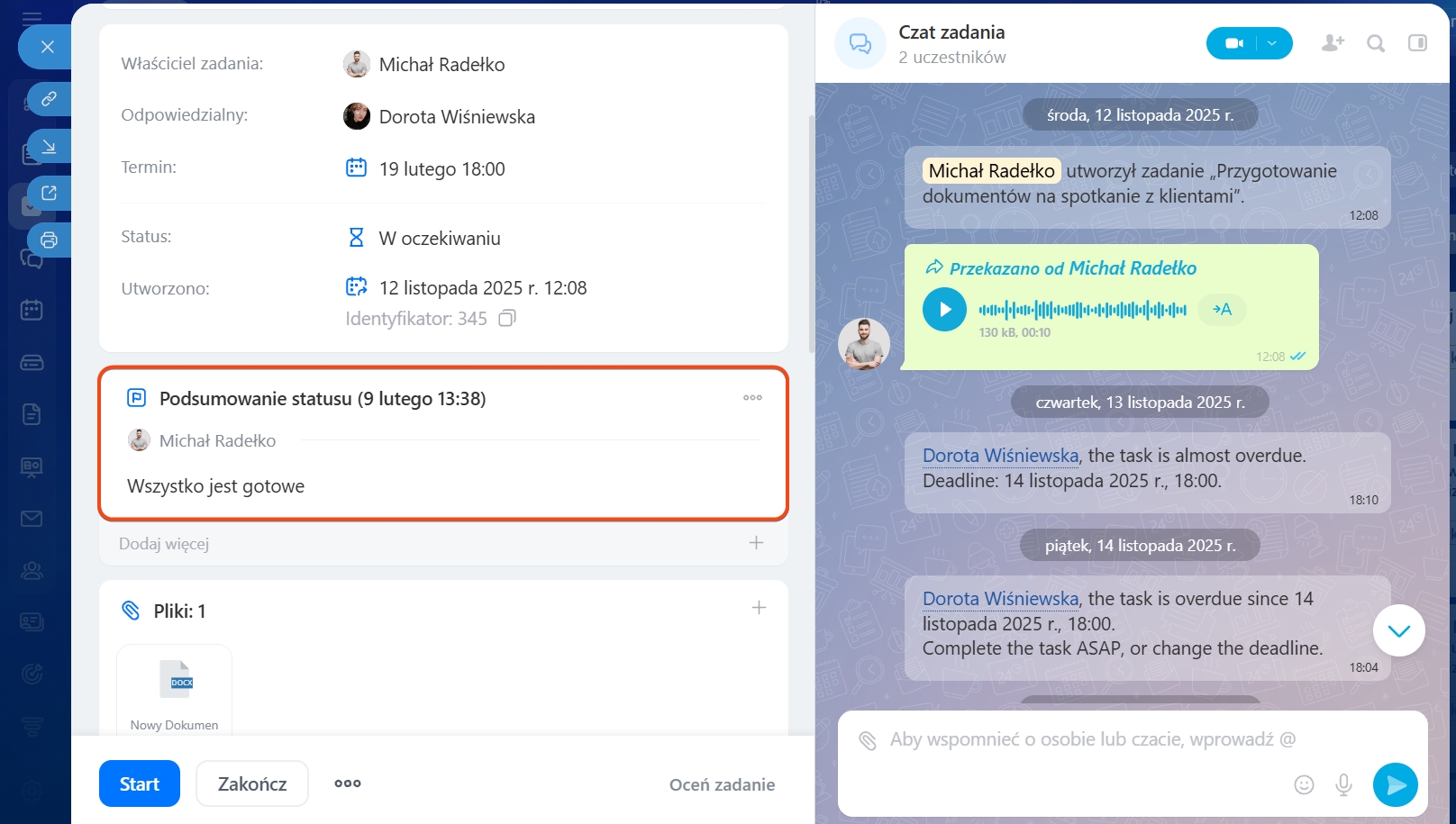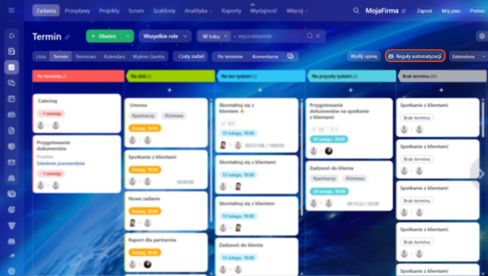 Skonfiguruj reguły automatyzacji i wyzwalacze, aby nowe zadania tworzyły się automatycznie, dodawali się uczestnicy, a terminy były monitorowane.