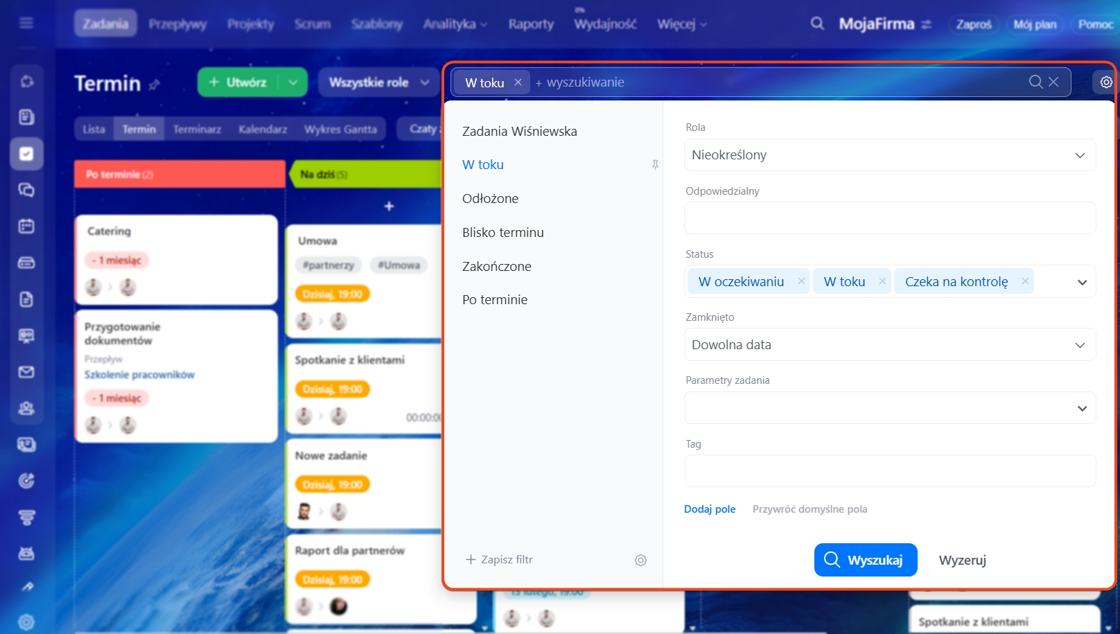 - Gotowe i własne filtry – w trakcie, zakończone, odłożone, przeterminowane, prawie przeterminowane. Inteligentne wyszukiwanie i filtry w zadaniach