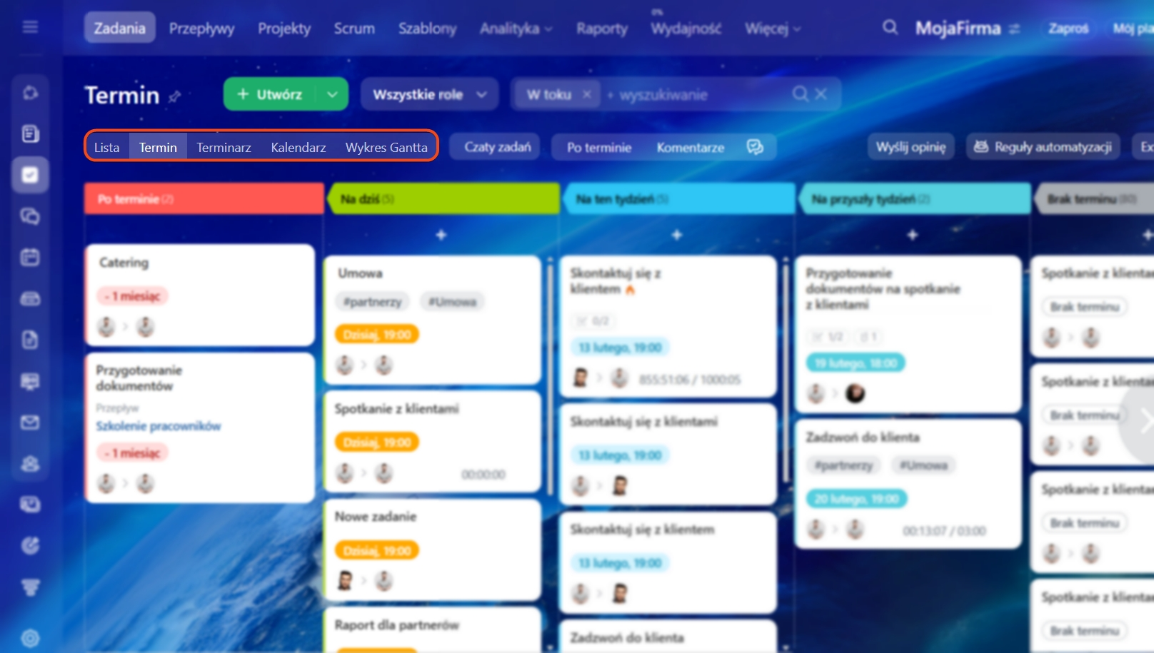 - Terminarz – pozwala sortować zadania według Twoich kryteriów: terminy, priorytet, status itp.