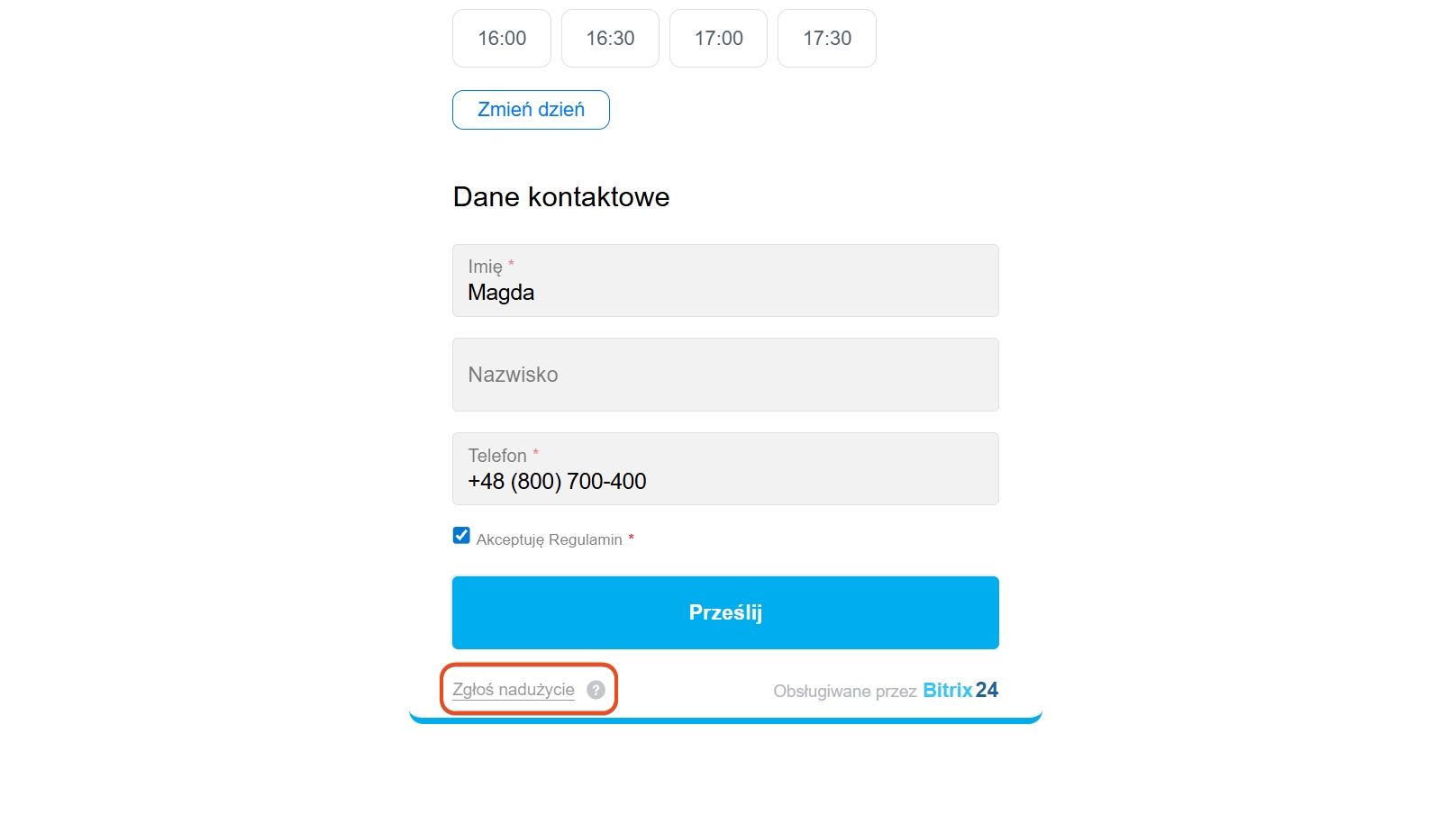 Każdy użytkownik może zgłosić naruszenie, jeżeli treść formularza CRM na przykład: