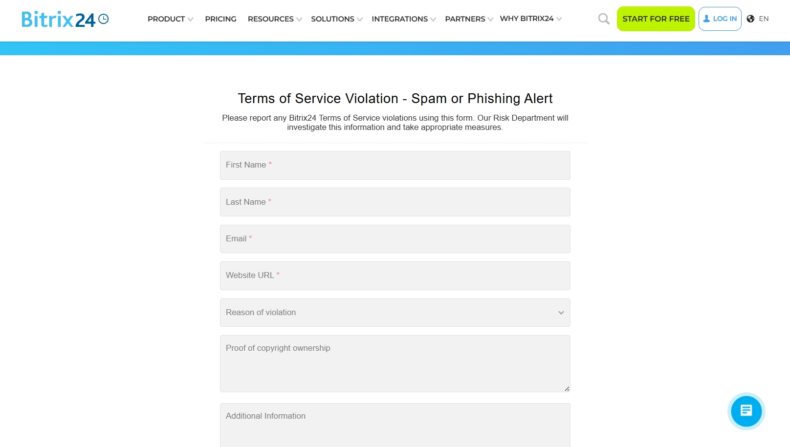 Bitrix24 udostępnia narzędzia do pracy z formularzami CRM, ale nie weryfikuje ich zawartości. Jeśli formularz narusza prawa użytkowników lub przepisy prawa, można zgłosić ten fakt. W przypadku dużej liczby skarg Bitrix24 rozpatrzy zgłoszenia i podejmie odpowiednie działania.