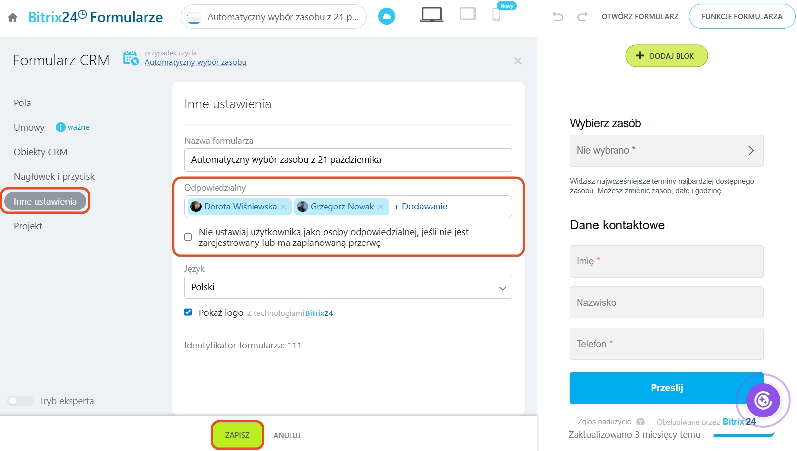 - Odpowiedzialny – wybierz pracowników z listy. Elementy tworzone w CRM po wypełnieniu formularza będą rozdzielane między odpowiedzialnych po kolei.