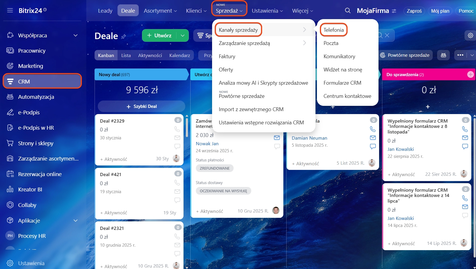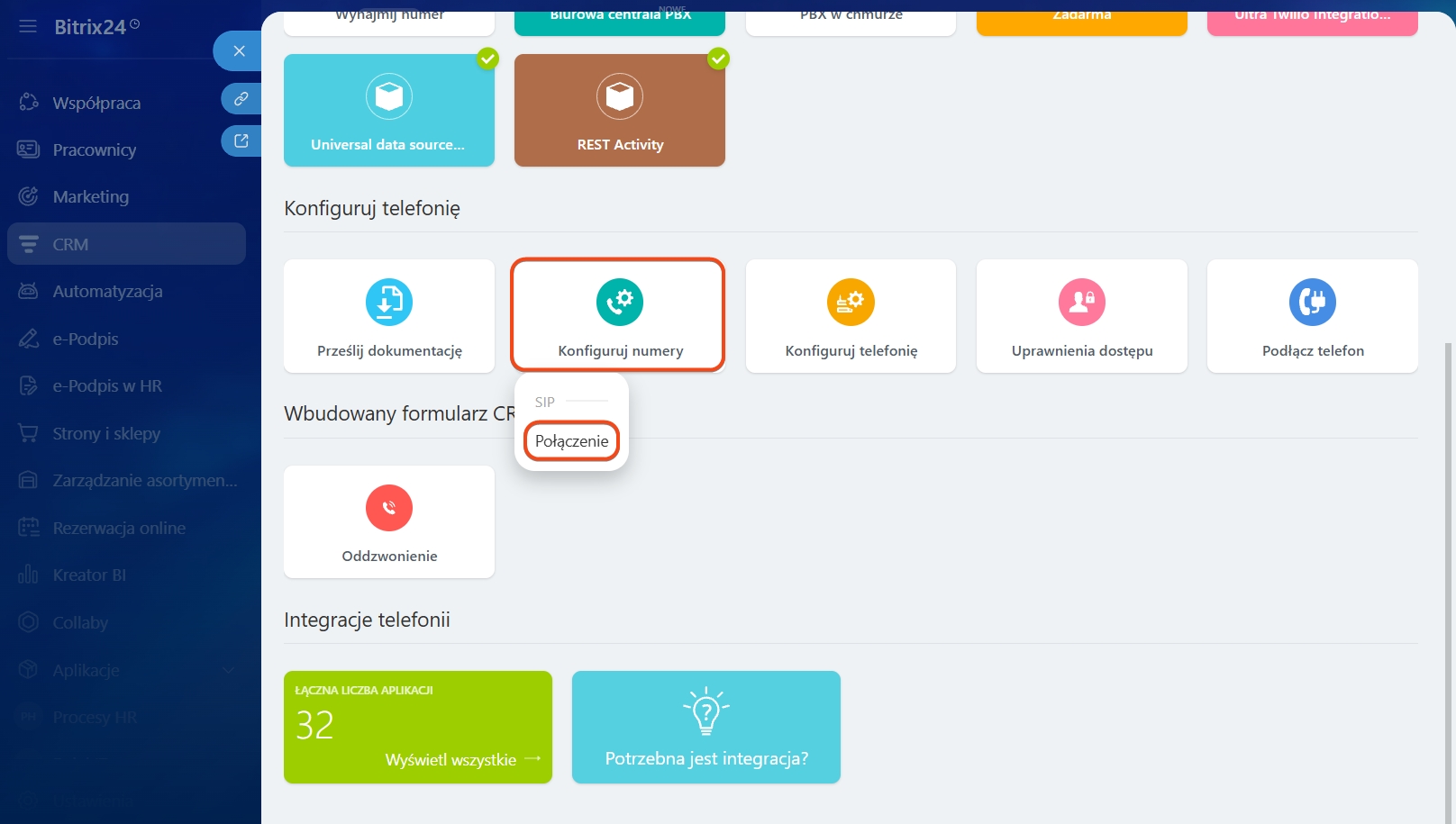 1–4. Przejdź do CRM → Sprzedaż → Kanały sprzedaży → Telefonia.