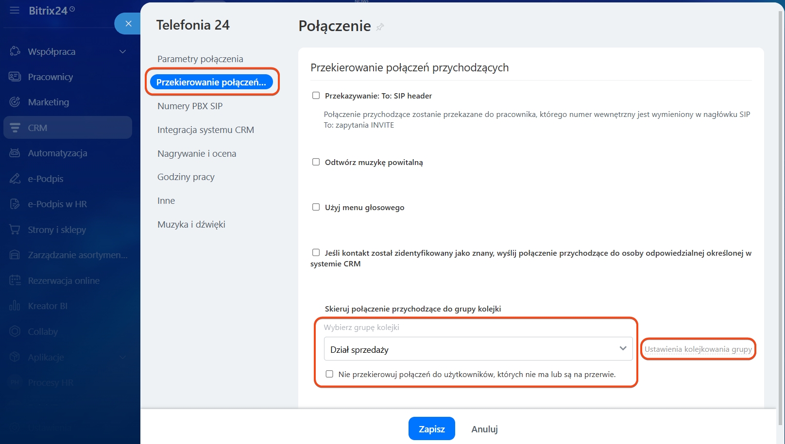 - Rozdzielanie połączeń przychodzących między pracownikami konfiguruje się w CRM → Sprzedaż → Kanały sprzedaży → Telefonia → Konfiguracja numerów. Wybierz numer, przejdź do zakładek Przekierowanie połączeń przychodzących oraz Integracja z CRM.
