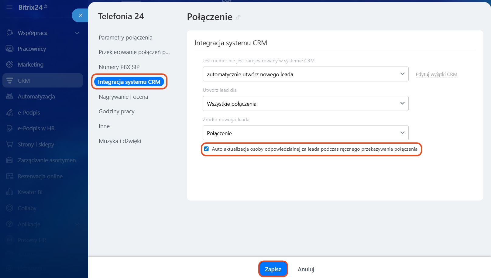 14. Włącz opcję Auto aktualizacja osoby odpowiedzialnej za lead podczas ręcznego przekazywania połączenia, jeśli chcesz zmieniać odpowiedzialnego podczas przekazywania połączenia.