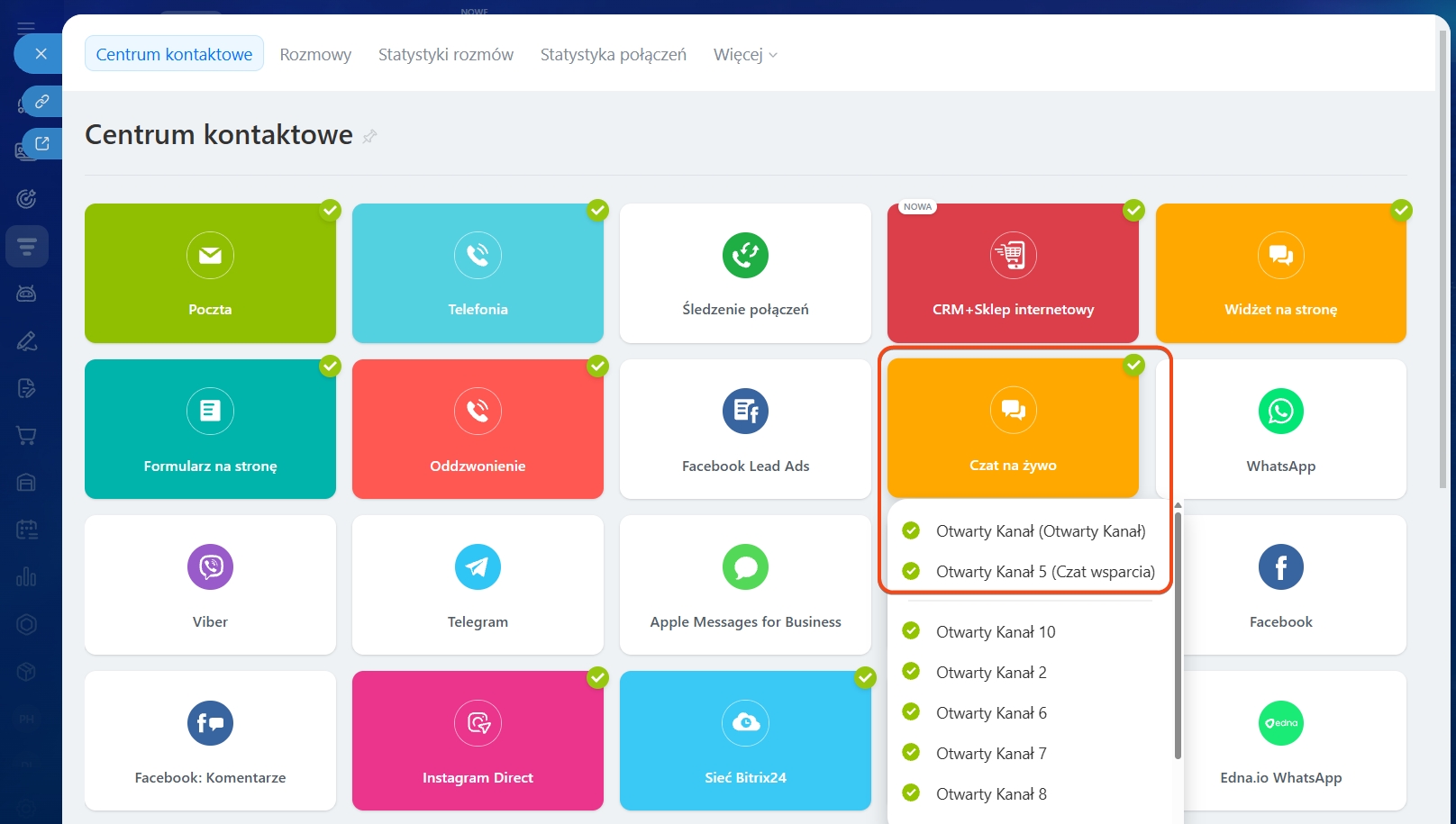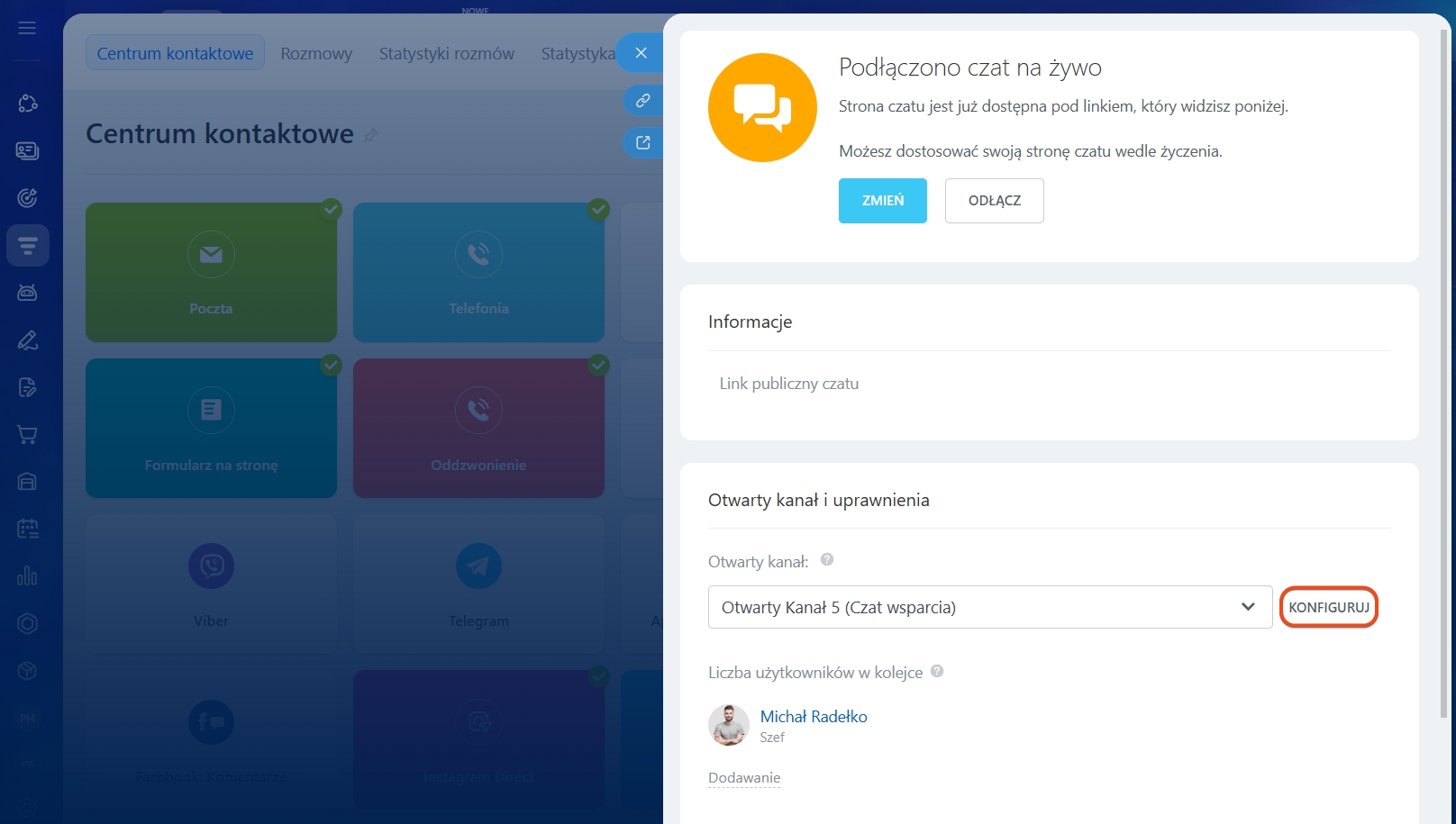 - Rozdzielanie zapytań z komunikatorów i mediów społecznościowych konfiguruje się w CRM → Sprzedaż → Kanały sprzedaży → Centrum Kontaktowe. Wybierz odpowiedni kanał i kliknij Konfiguruj.