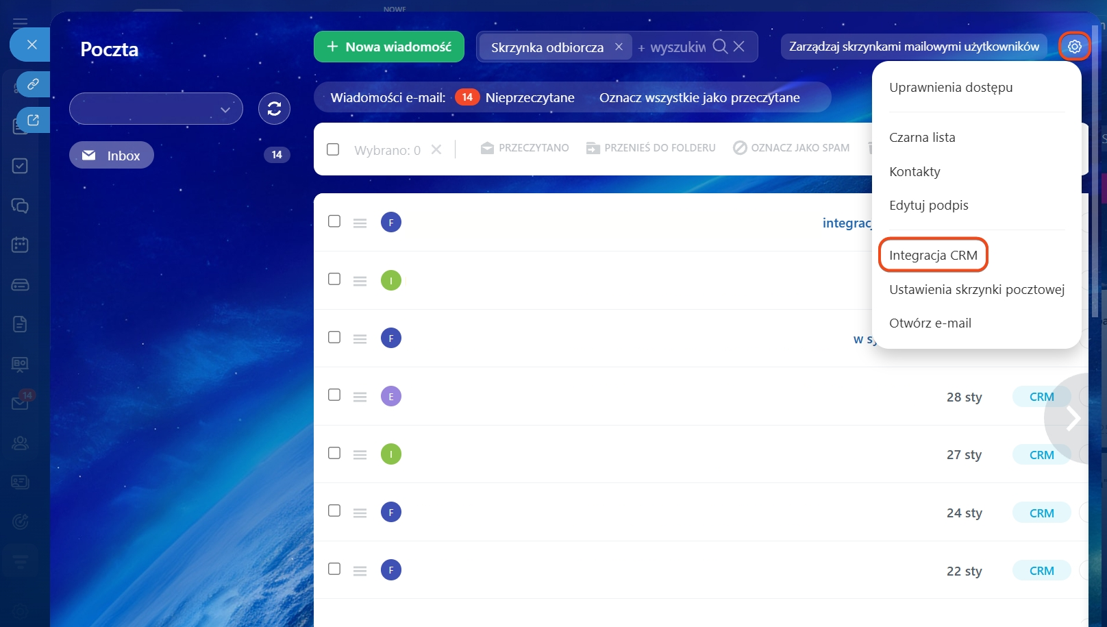 1–3. Przejdź do sekcji Poczta → Ustawienia (⚙️) → Integracja z CRM.