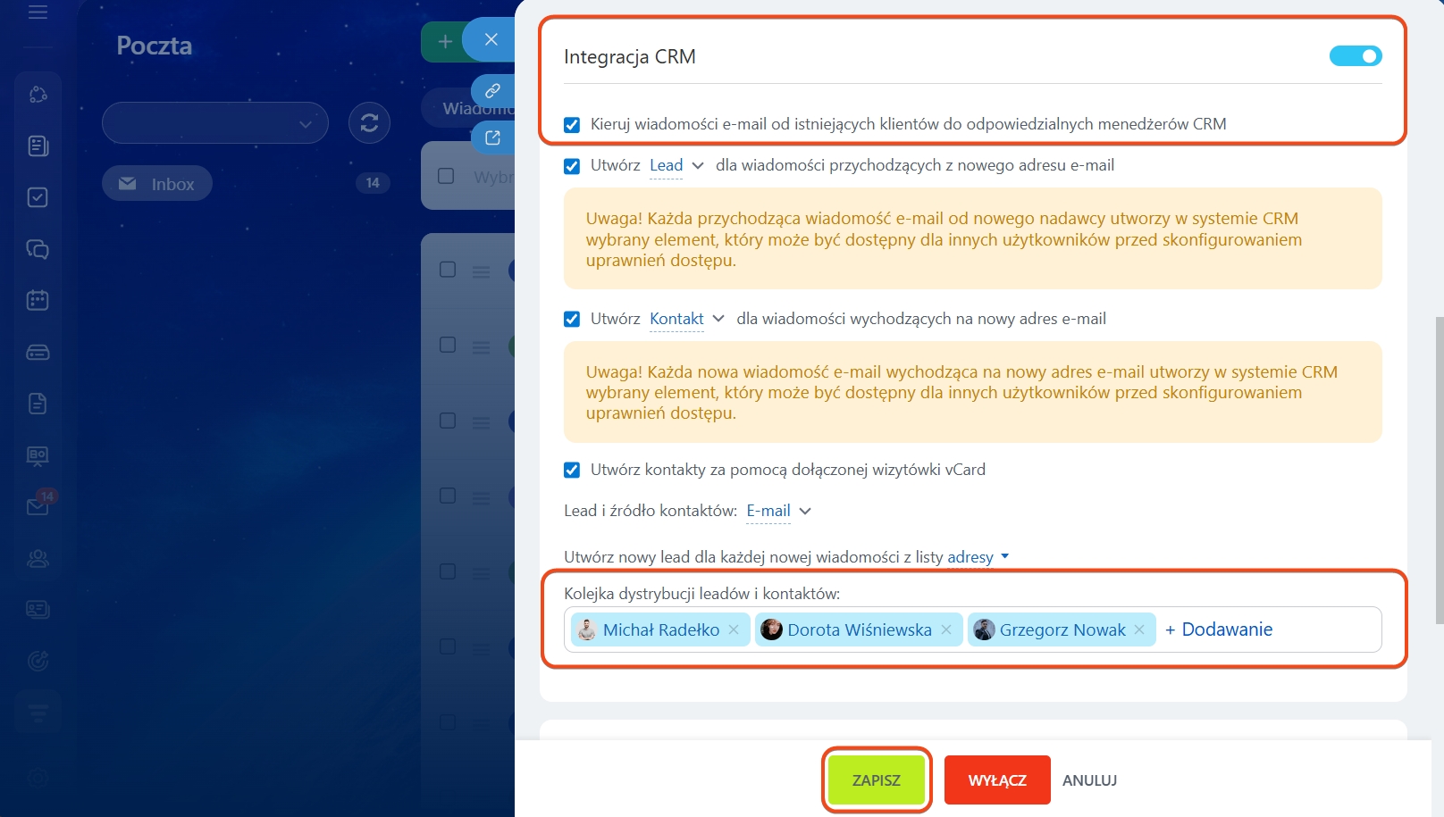 - Kolejka dystrybucji leadów i kontaktów – wybierz pracowników, którym CRM będzie przypisywać zapytania. Nowe elementy CRM rozdzielą się między nimi w kolejności, w jakiej podano ich nazwiska.