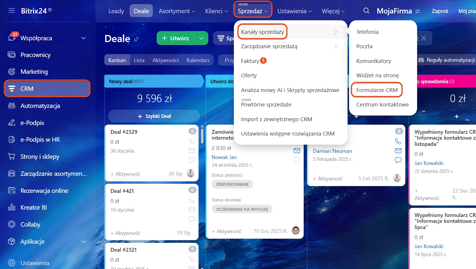 1–4. Przejdź do CRM → Sprzedaż → Kanały sprzedaży → Formularze CRM.