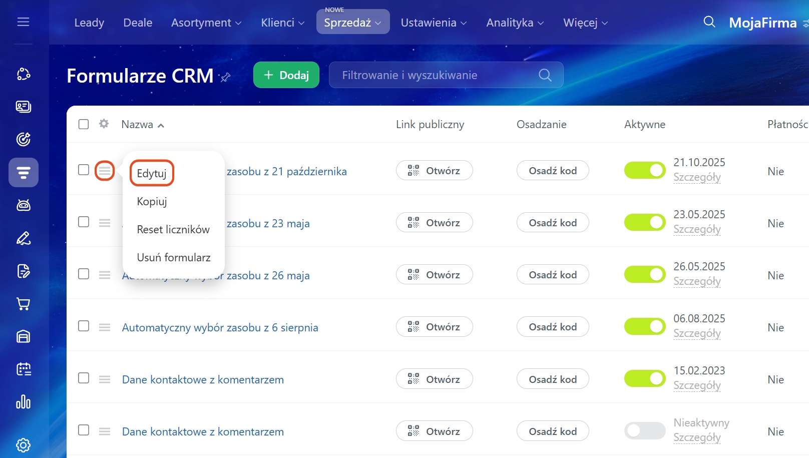 5–6. Kliknij Menu (≡) → Edytuj obok wybranej formy.