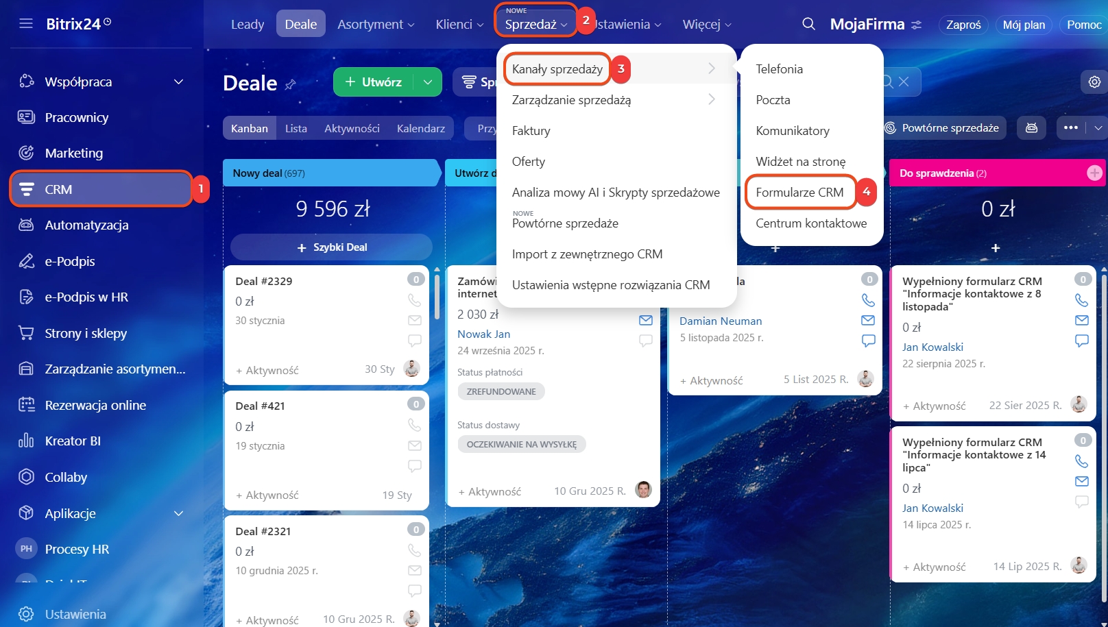 1–4. Przejdź do sekcji CRM → Sprzedaż → Kanały sprzedaży → Formularze CRM.