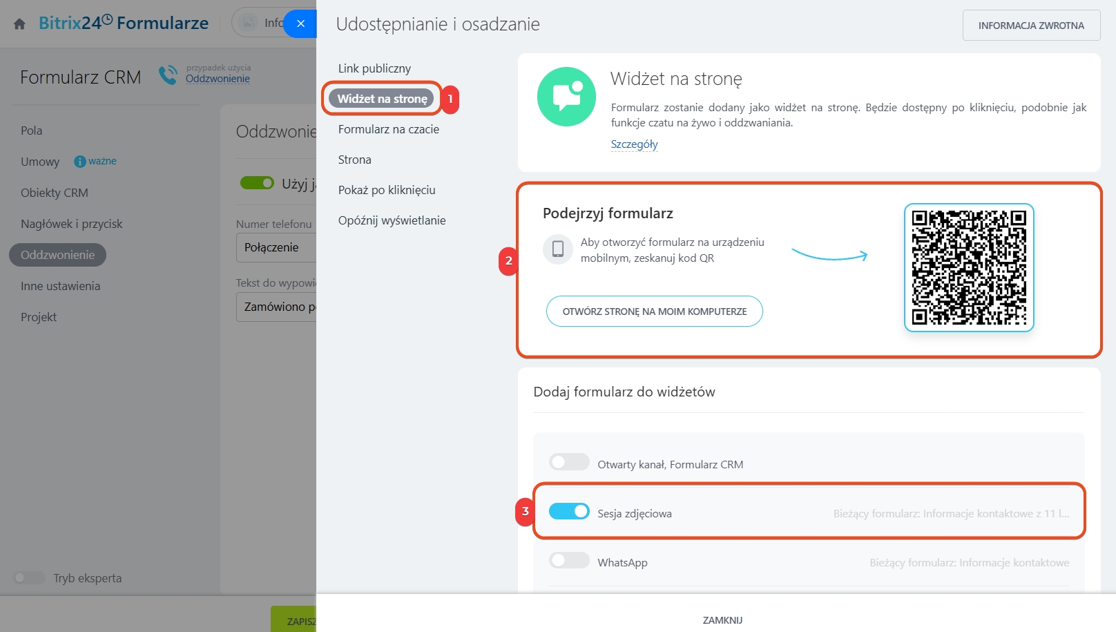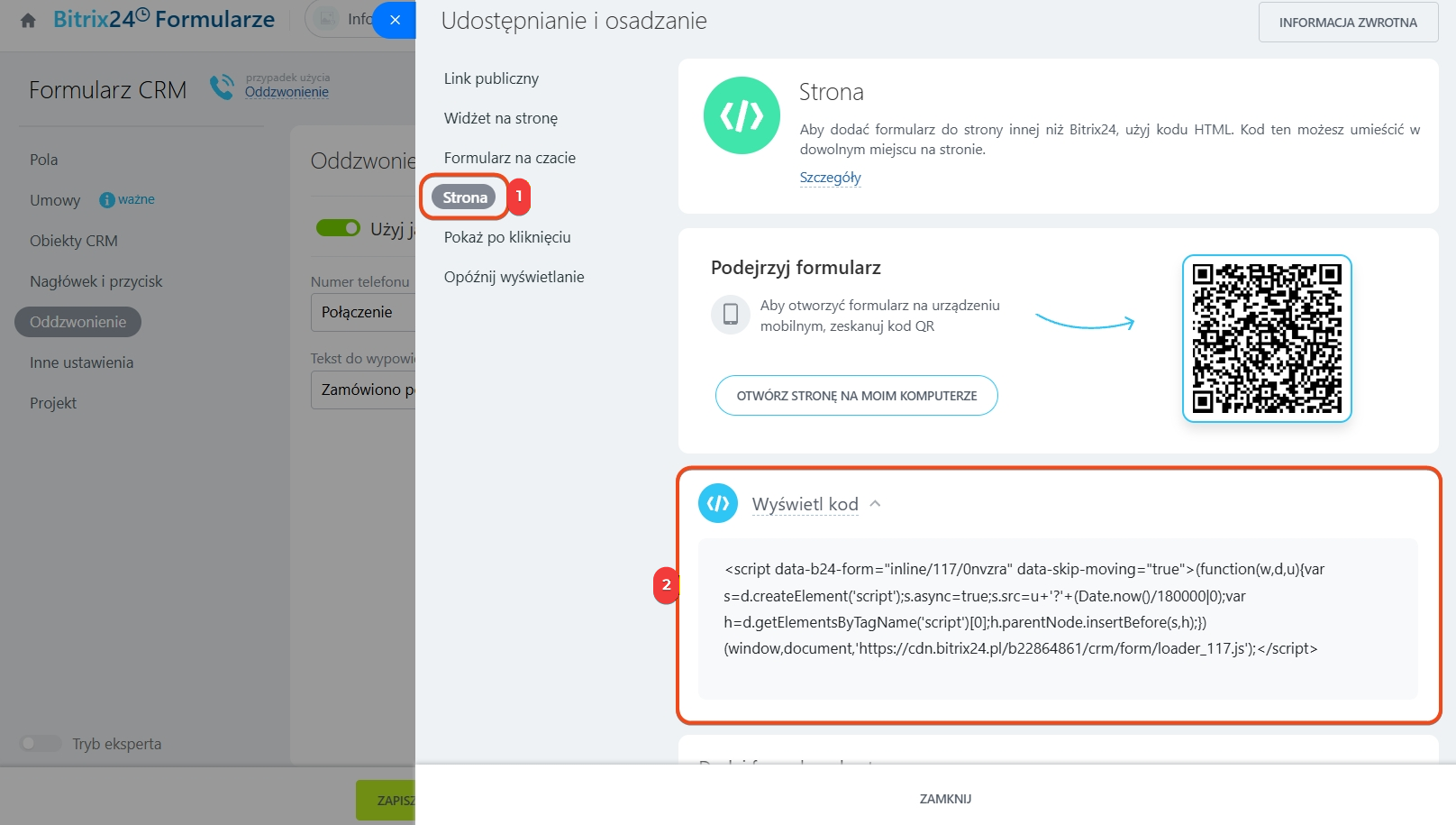 2. Sprawdź, jak będzie wyglądał formularz oddzwonienia na stronie. Aby zobaczyć podgląd na komputerze, kliknij Otwórz stronę na komputerze, a na telefonie – zeskanuj kod QR.
