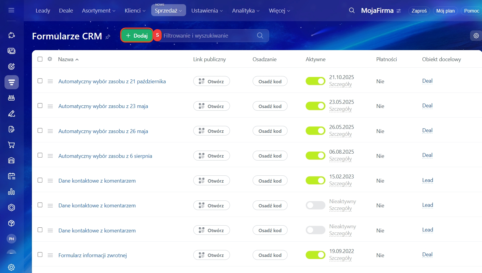 Przegląd formularzy internetowych CRM