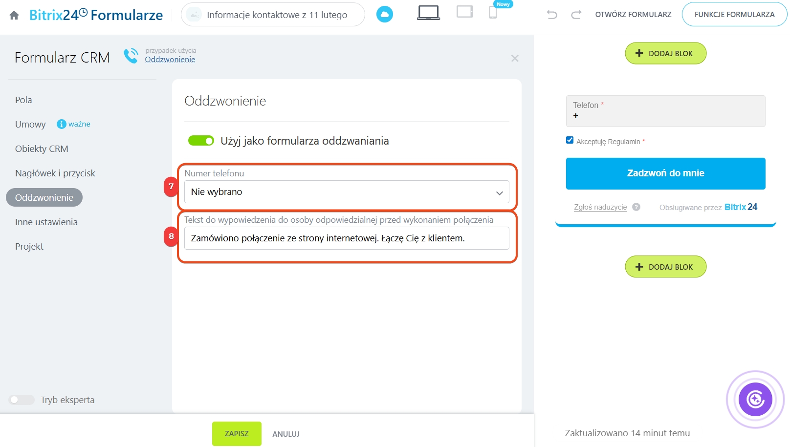 7. W polu Numer telefonu wybierz numer, z którego ma zostać wykonany telefon do klienta.
