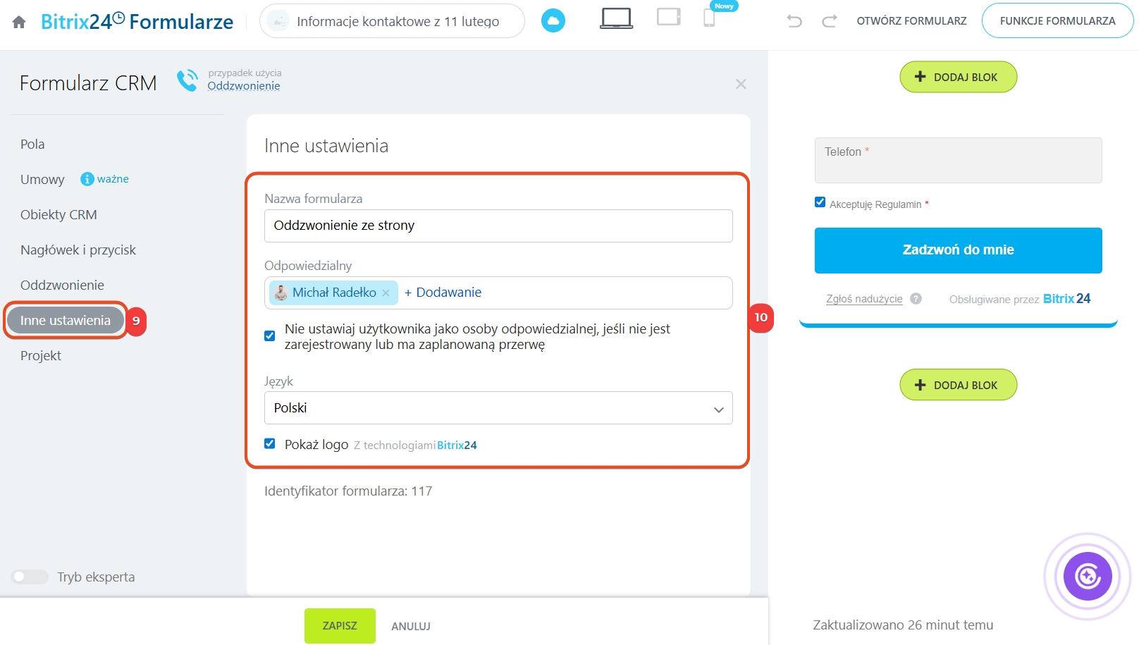 - przypisz Odpowiedzialnych – to do nich będą kierowane elementy CRM powstałe po wypełnieniu formularza,