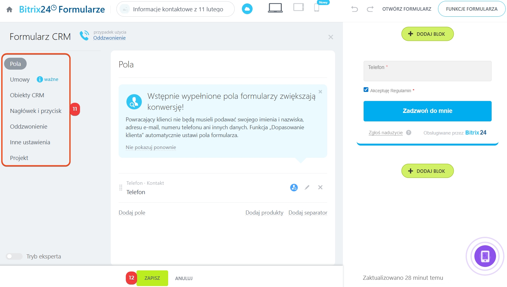 - Formularz oddzwonienia może utworzyć administrator Bitrix24 oraz pracownicy z uprawnieniem do edycji formularzy CRM.