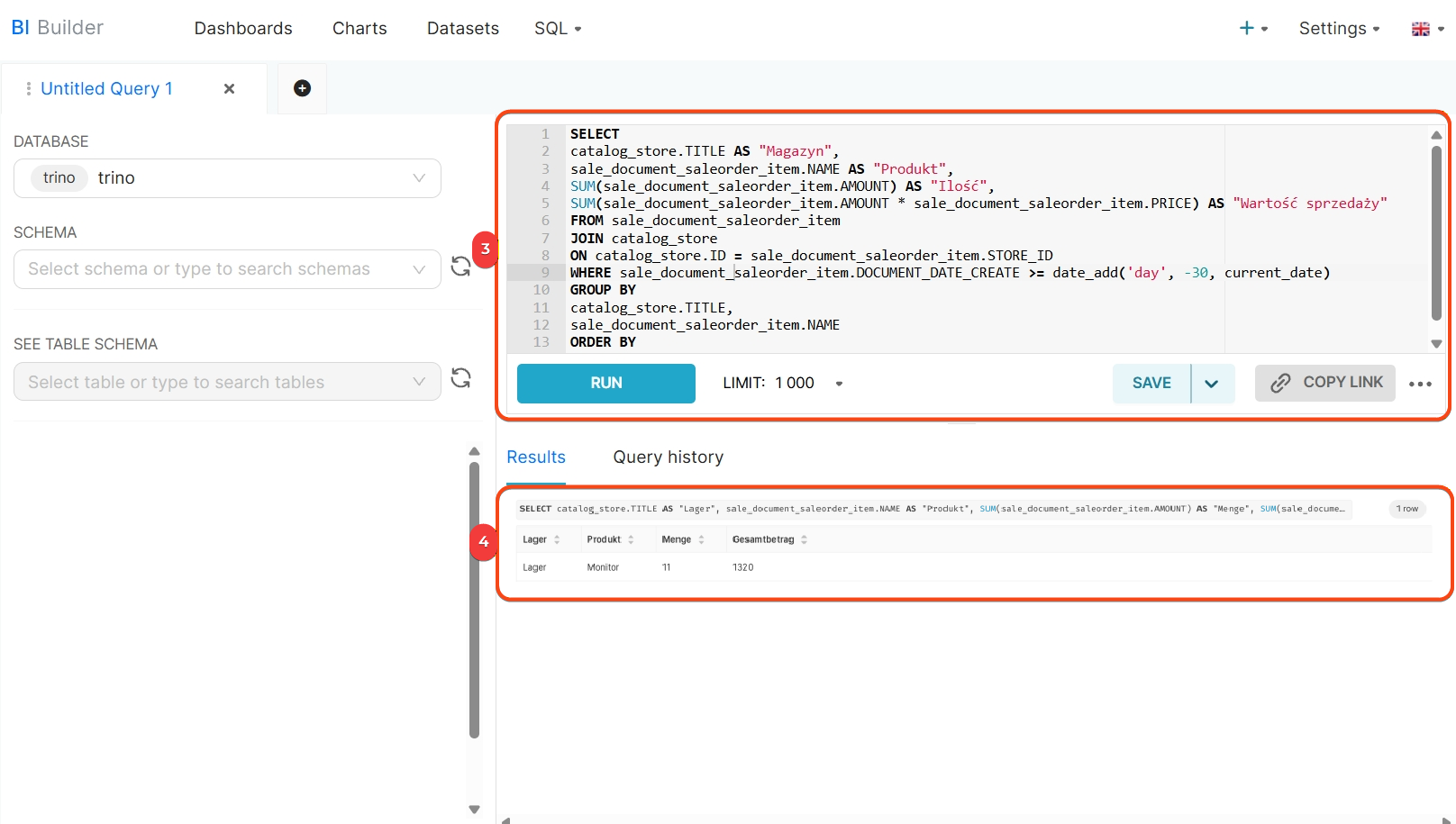 - Zestawy danych można łączyć – na przykład skład dokumentów sprzedaży z magazynami – aby zbadać sprzedaż według lokalizacji. Wystarczy napisać zapytanie SQL, zapisać wynik jako dataset i utworzyć wykres.