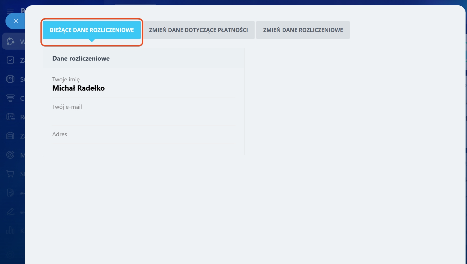Aby zaktualizować dane rozliczeniowe, przejdź do zakładki Zmień dane rozliczeniowe. Wypełnij formularz i kliknij Aktualizuj.