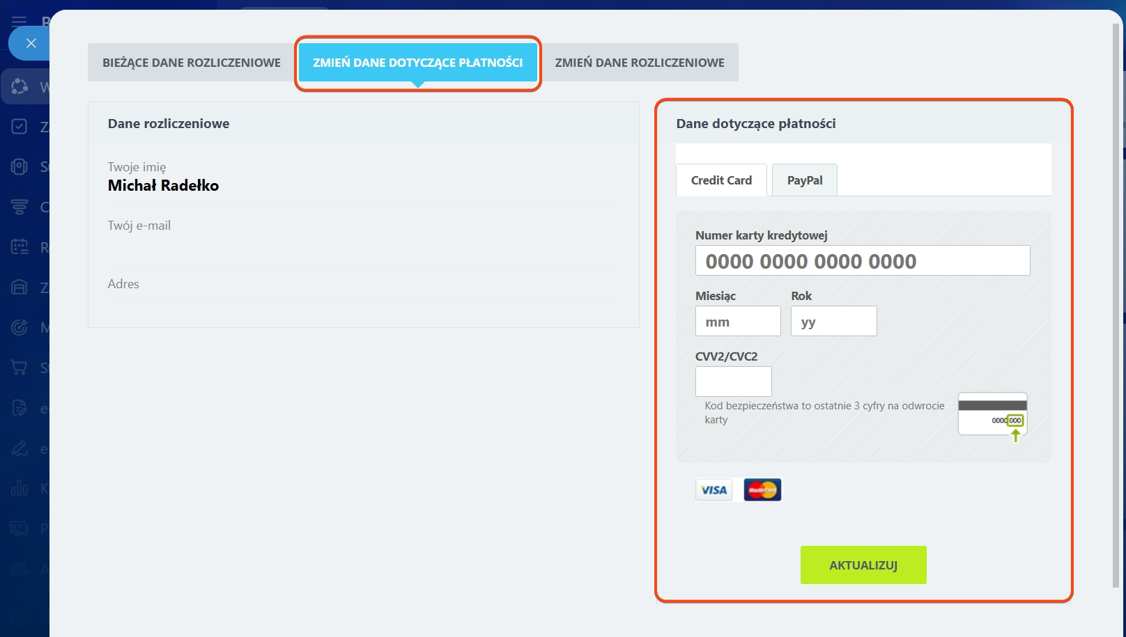 Aby zaktualizować dane płatnicze (karta kredytowa lub PayPal), przejdź do zakładki Zmień informacje o płatności. Wprowadź nowe dane i kliknij Aktualizuj.