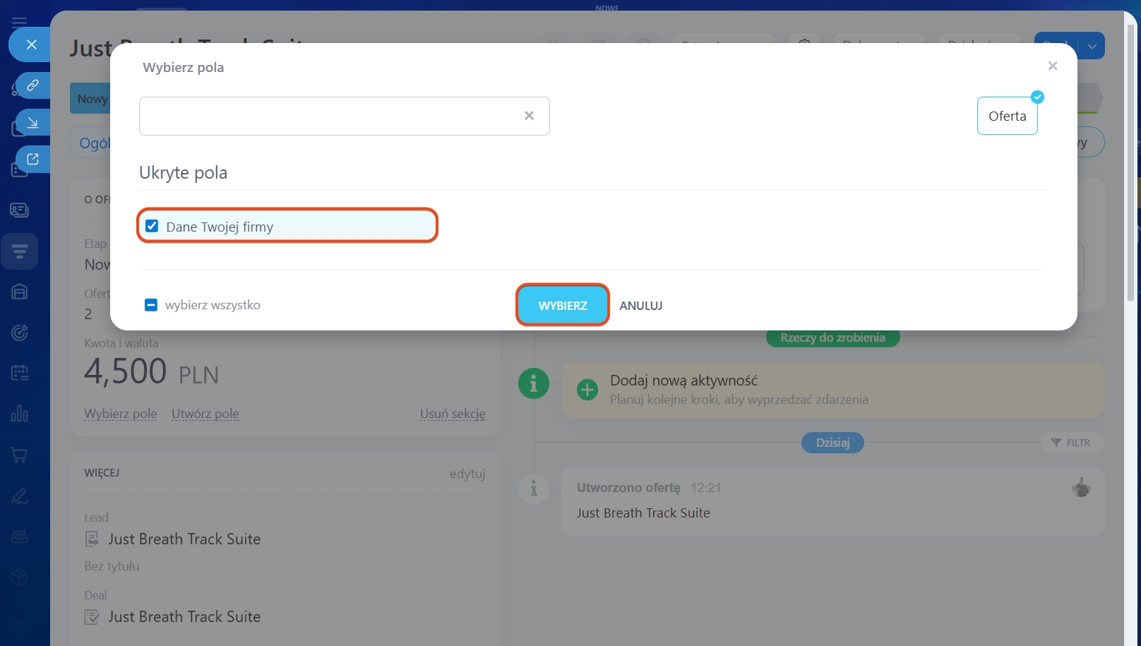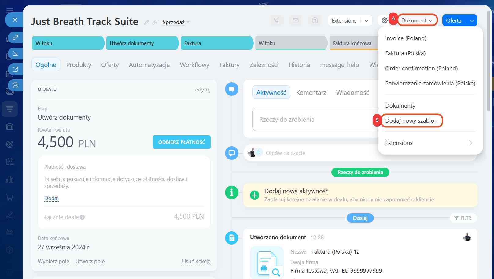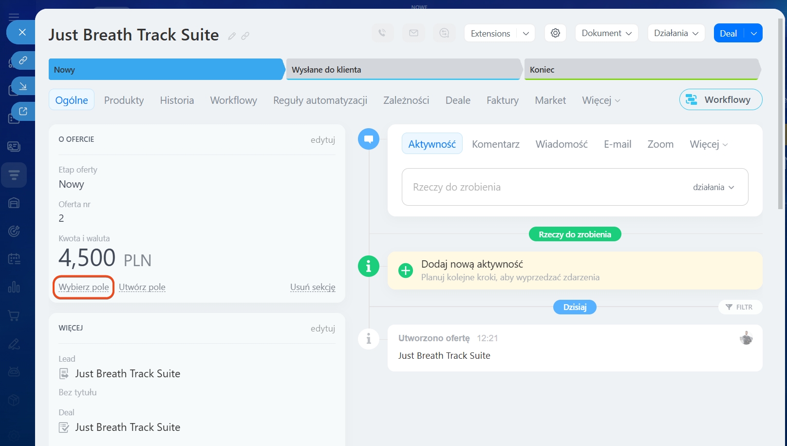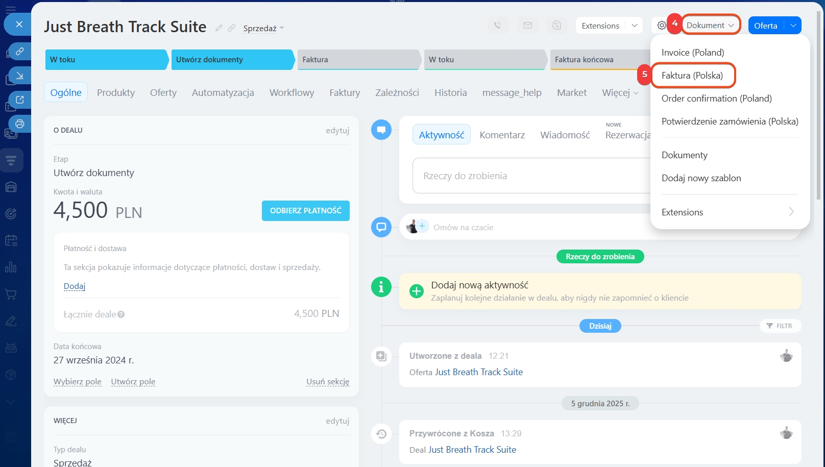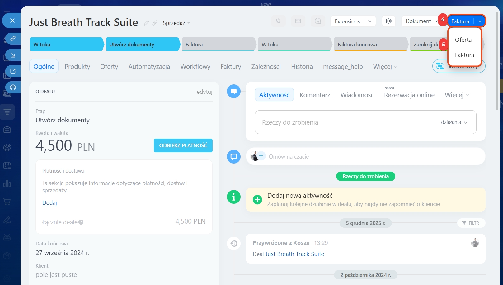 1–3. Przejdź do CRM > Deale i otwórz wybrany.