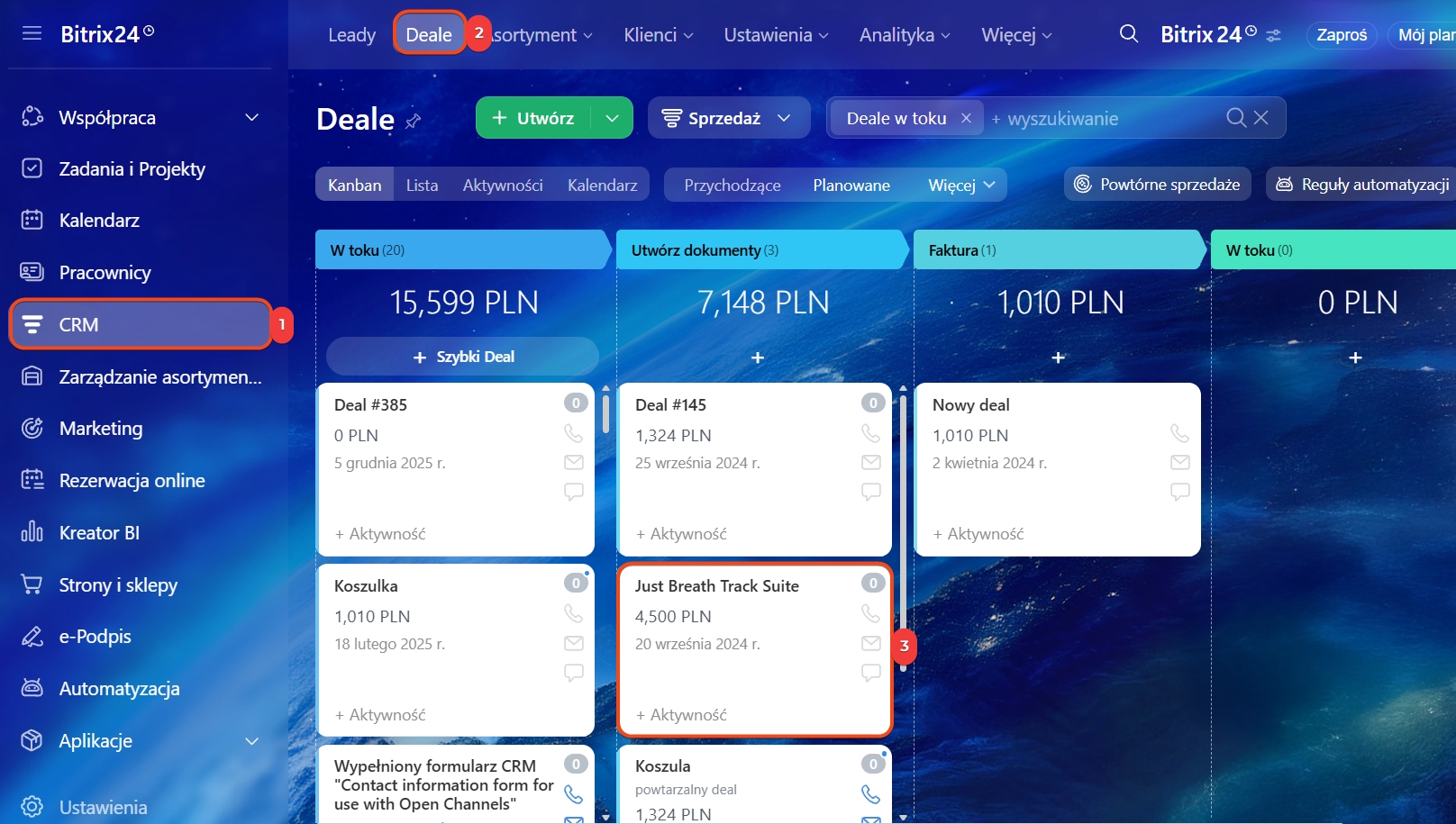1–3. Przejdź do CRM > Deale i wybierz właściwy.
