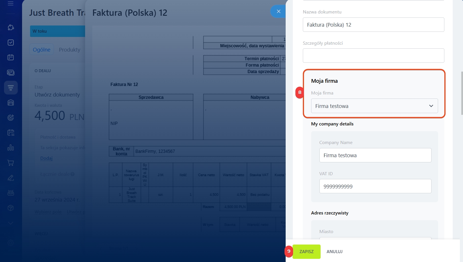 10. W polu Deal wybierz Moja firma > Dane firmy.