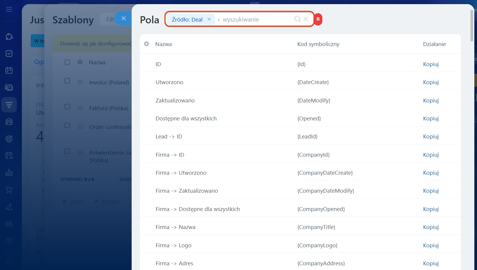 Poniżej wyjaśniono ustawienia na przykładzie dokumentów tworzonych z deala. Te same kroki działają również dla innych elementów CRM.