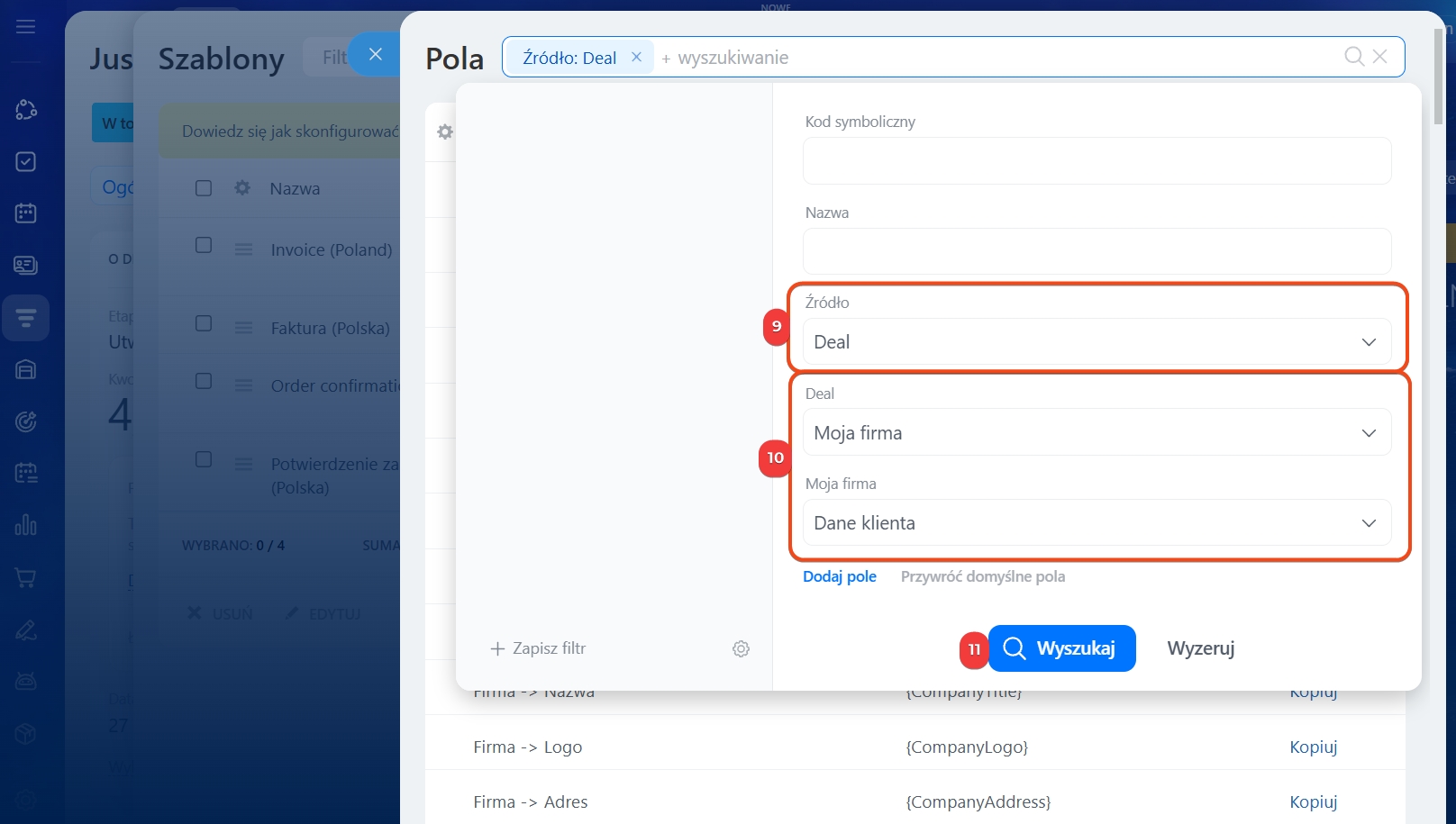 Własne szablony dokumentów. Jeśli korzystasz z własnych szablonów, dodaj dane firmy ręcznie. Służą do tego kody symboliczne – specjalne oznaczenia pól CRM, które podczas generowania dokumentu zamieniają się na rzeczywiste dane.