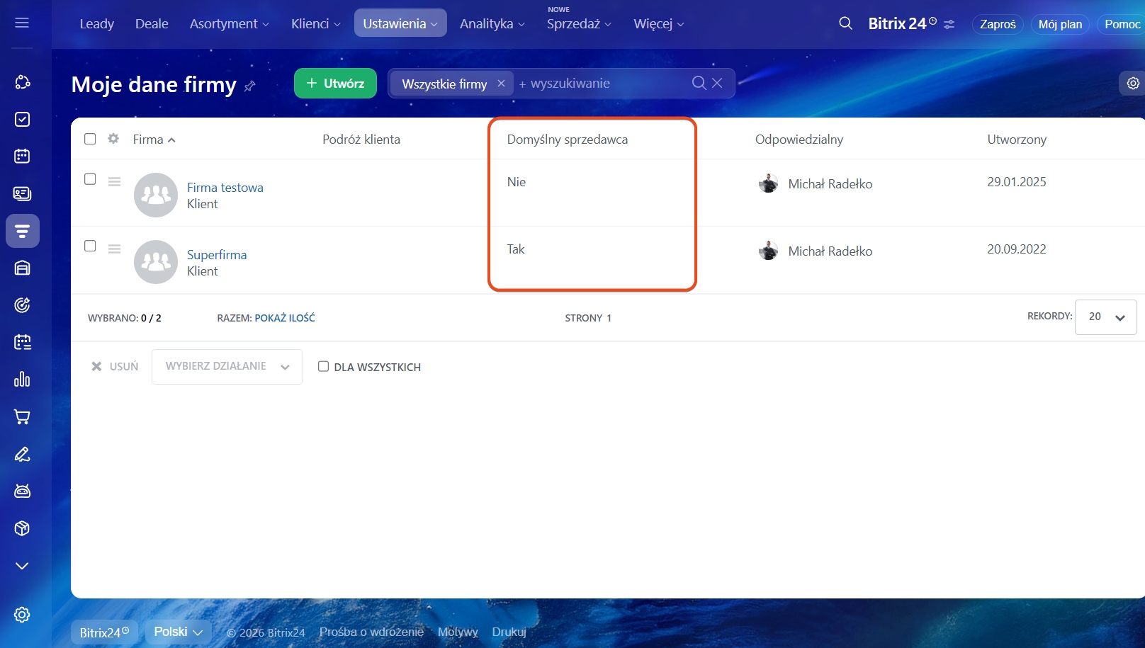 - Domyślnie Bitrix24 wstawia dane firmy głównej z sekcji Moje dane firmy.